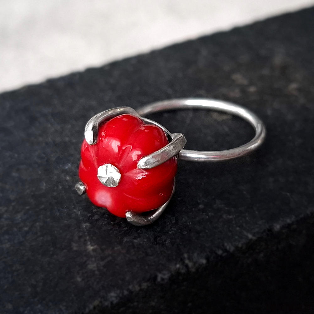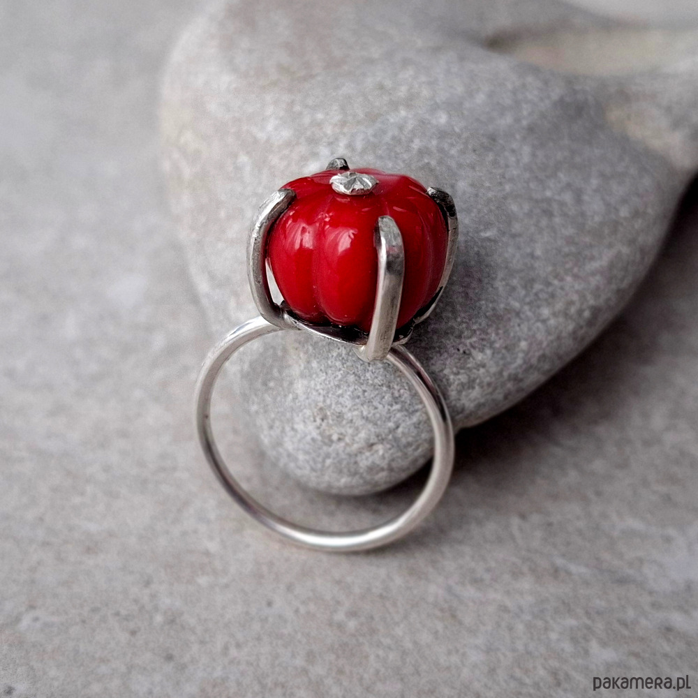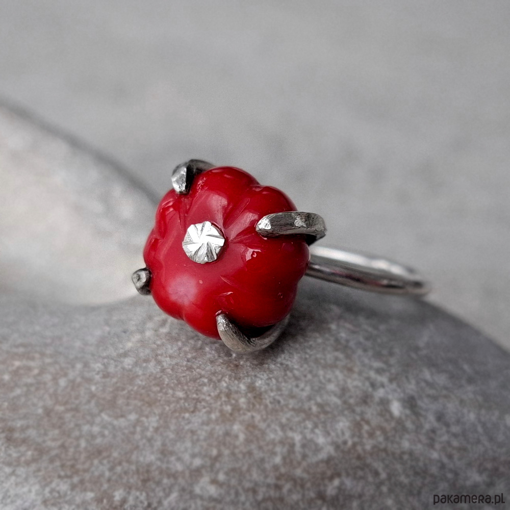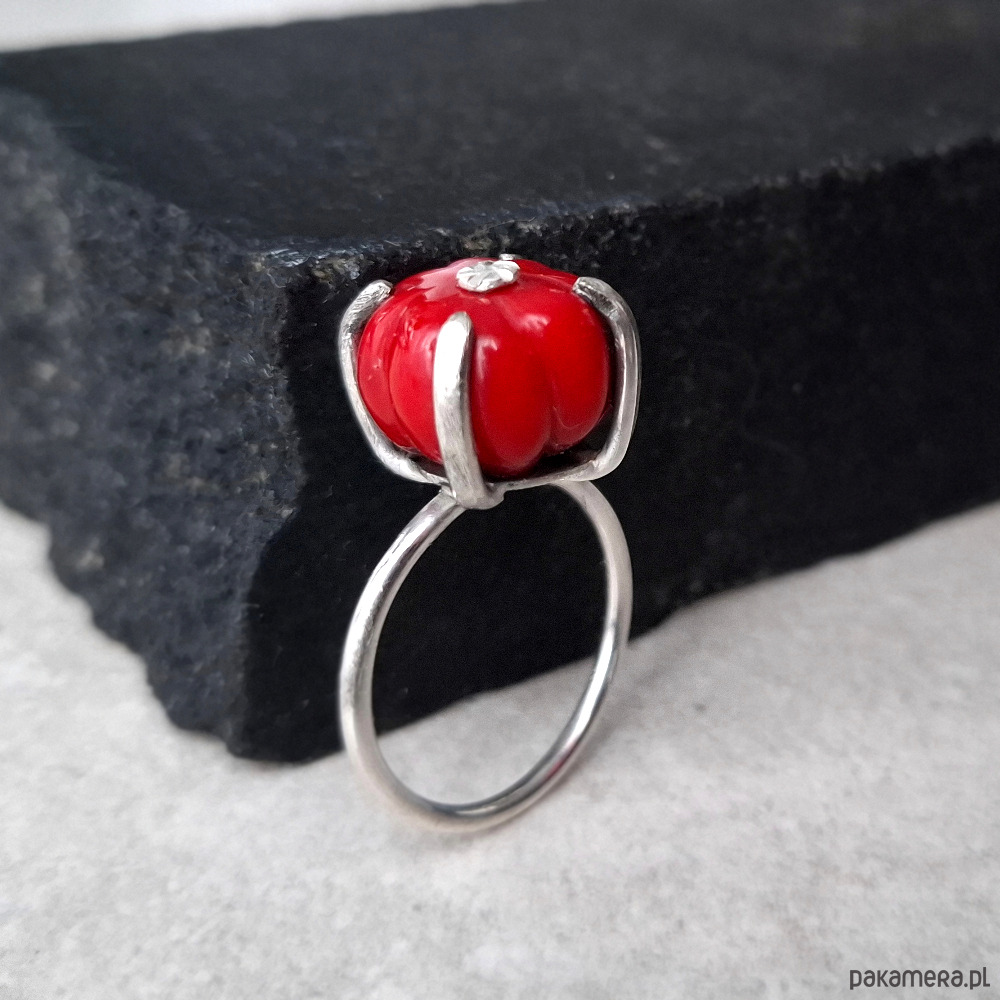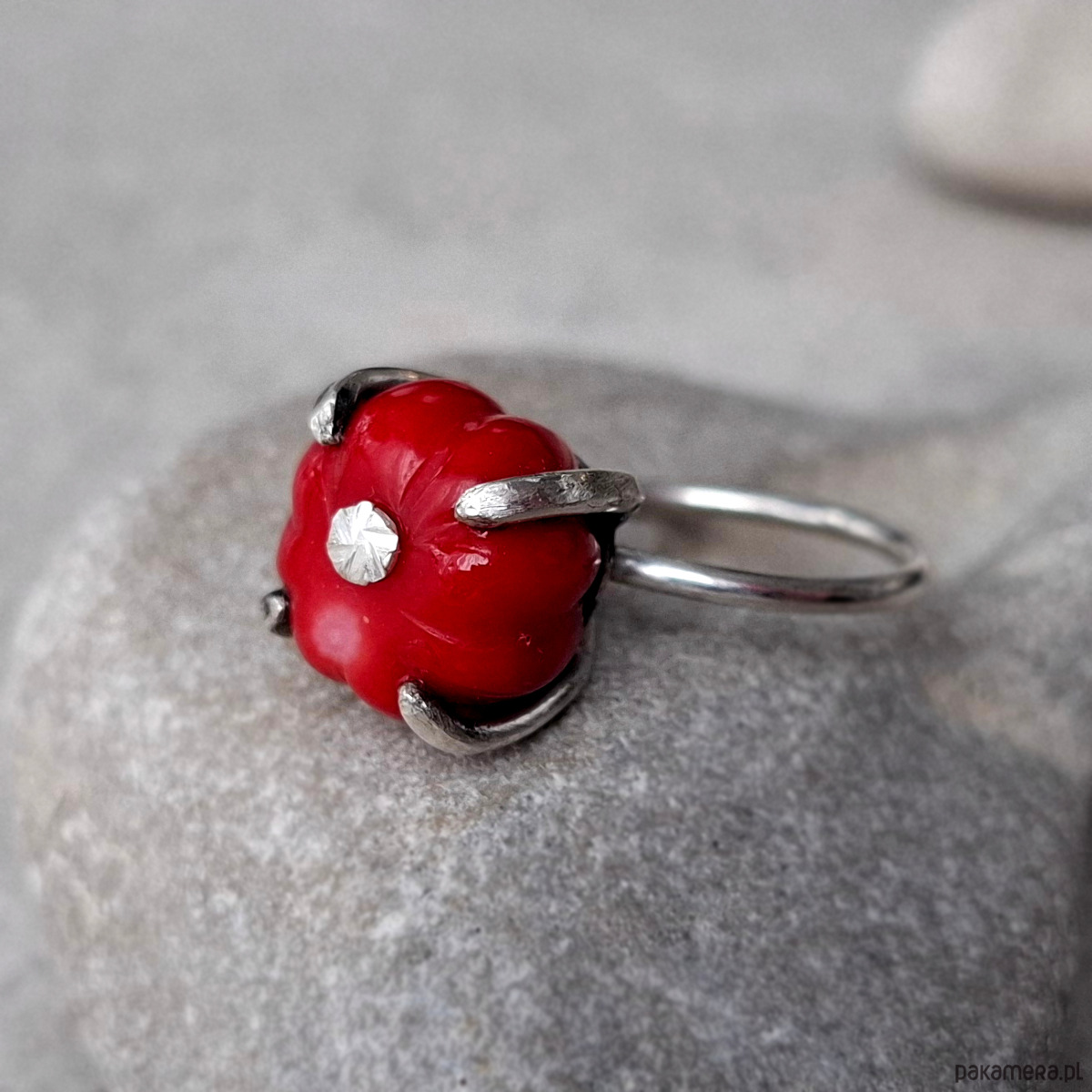 Delikatny, srebrny pierścionek ozdobiony czerwonym koralem o kształcie kwiatu. Korona pierścionka została osadzona na delikatnej obrączce. Całość wykonana ręcznie ze srebra 925 w jednym niepowtarzalnym egzemplarzu. Wymiary korony pierścionka: ok 10 mm. Rozmiar obrączki 14. Biżuteria zostanie ozdobnie zapakowana.