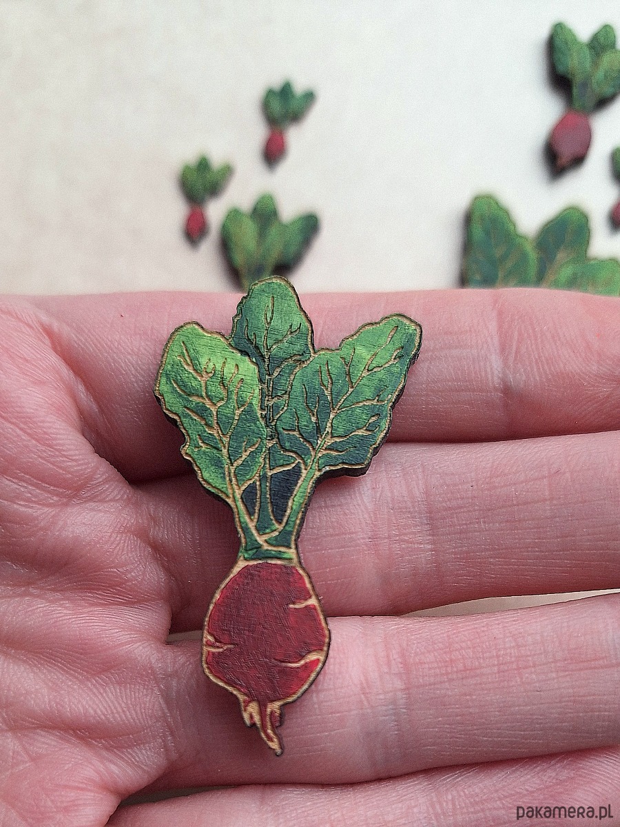 Broszka wykonana z drewna i ręcznie malowana, następnie lakierowana. Każda będzie niepowtarzalna. Wysokość ok. 4,5 cm