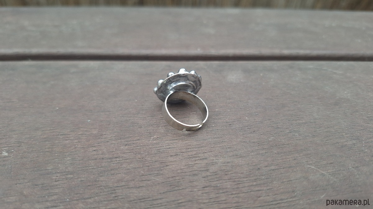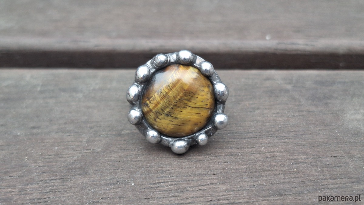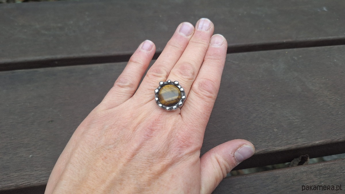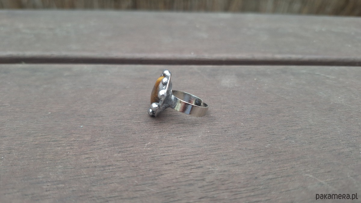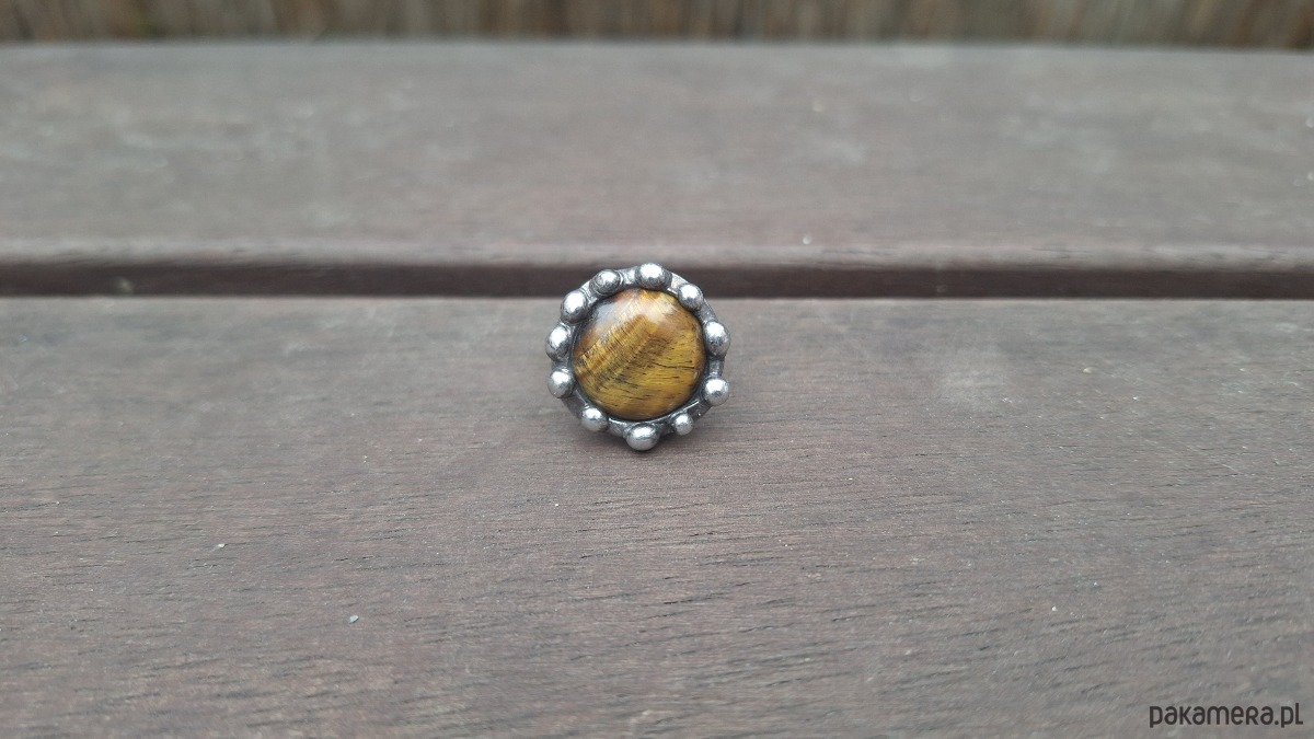 Pierścionek wykonany z miedzi, cyny i tygrysiego oka. Wymiary ok. 2 na 2 cm. Regulowany. Nie jest ciężki.