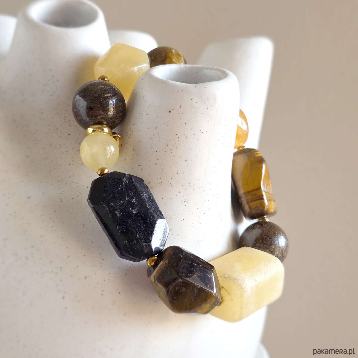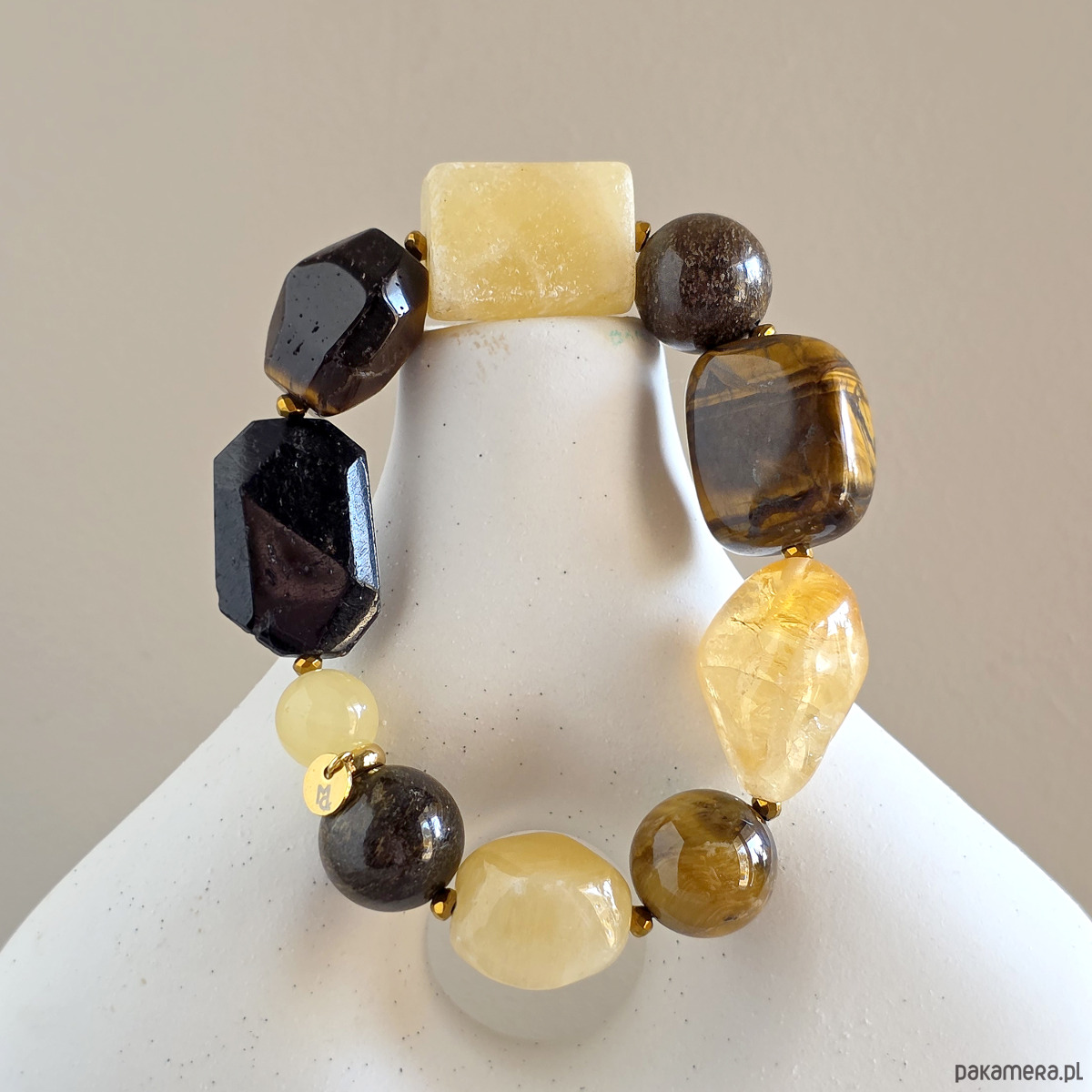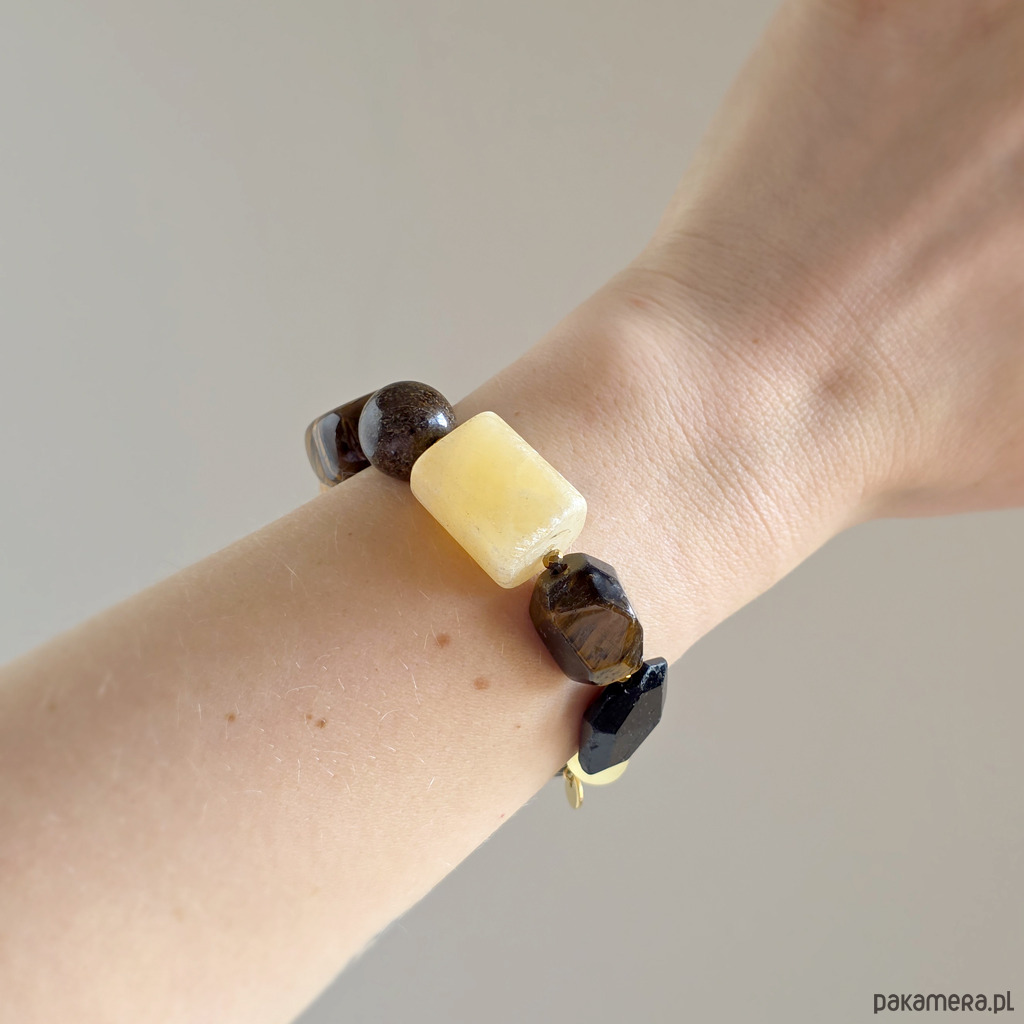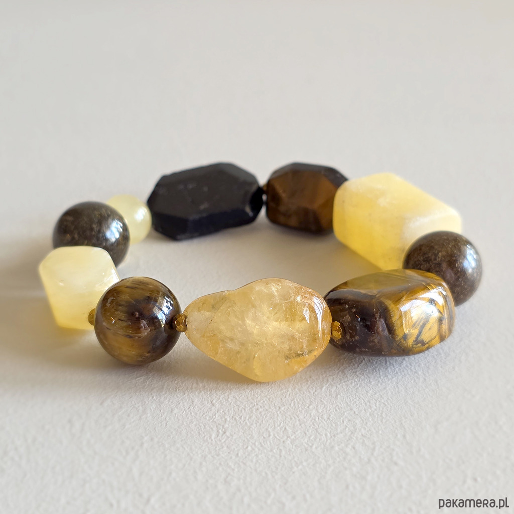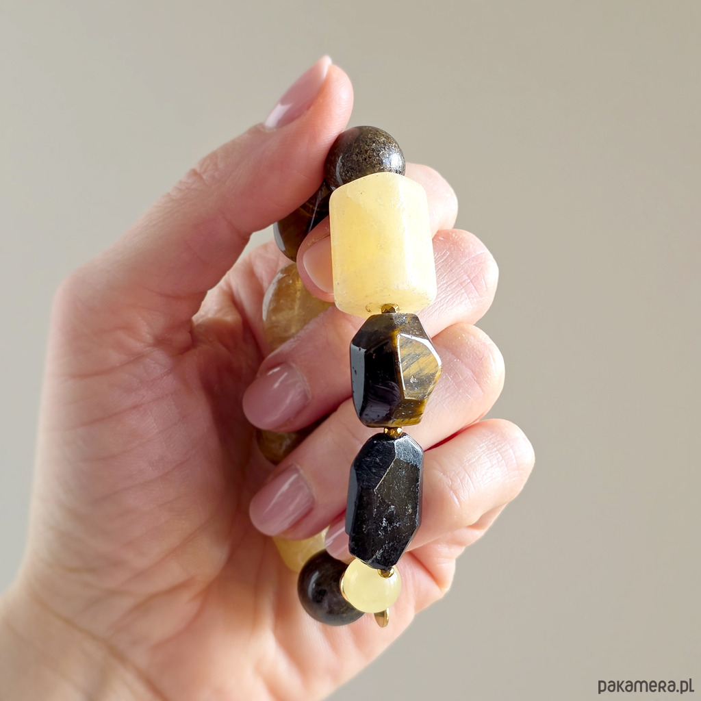 Bransoletka wykonana z kamieni naturalnych - czarnego turmalinu, cytrynu (prażony), tygrysiego oka, bronzytu, kalcytu żółtego i hematytu oraz mocnej gumki jubilerskiej. Bransoletka będzie odpowiednia na nadgarstek o obwodzie 15,5-16,5 cm.