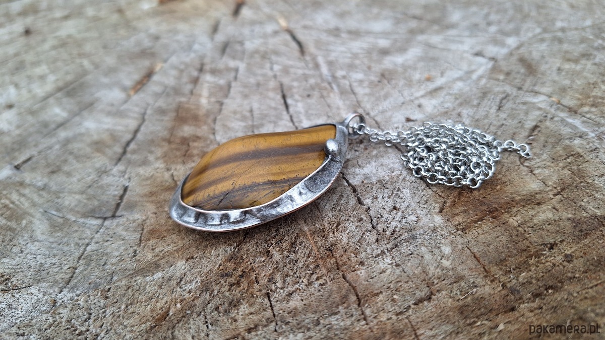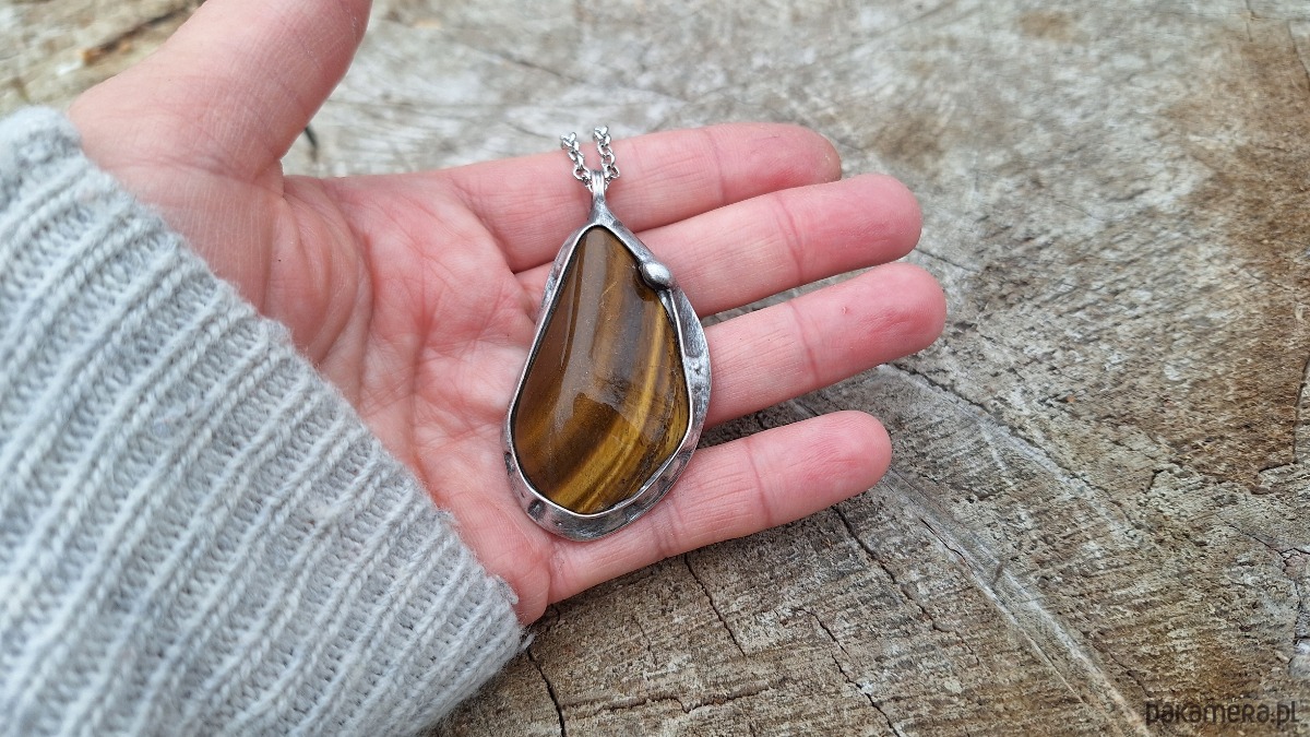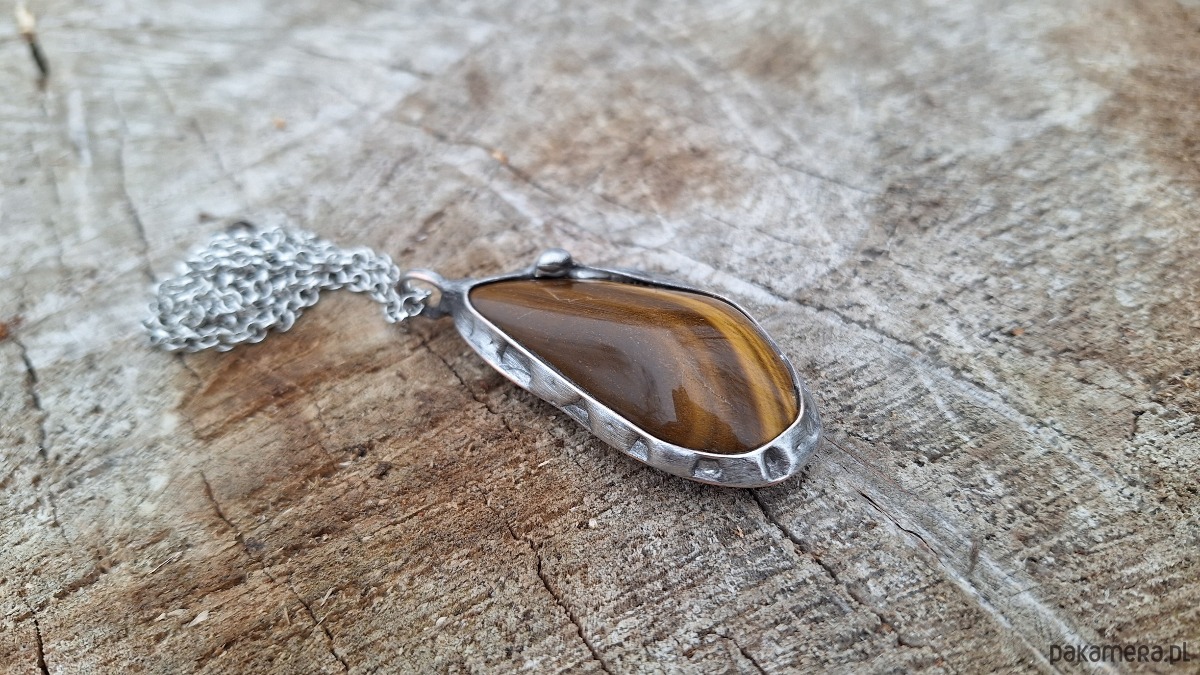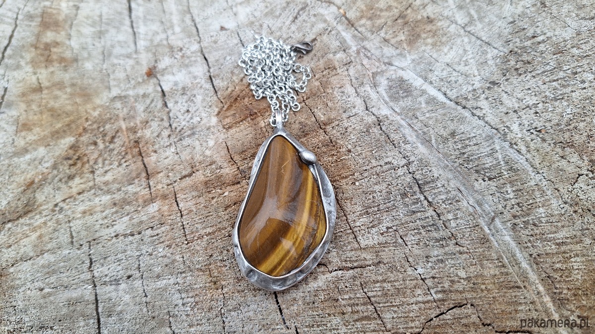 Wisiorek wykonany z miedzi, cyny i tygrysiego oka. Wymiary ok. 5.5 na 3 cm. Zawieszony na łańcuszku o długości ok. 50 cm.