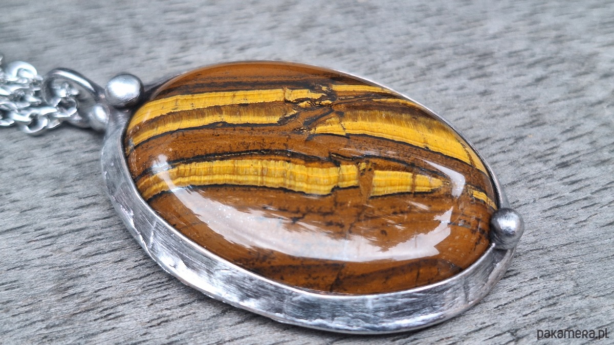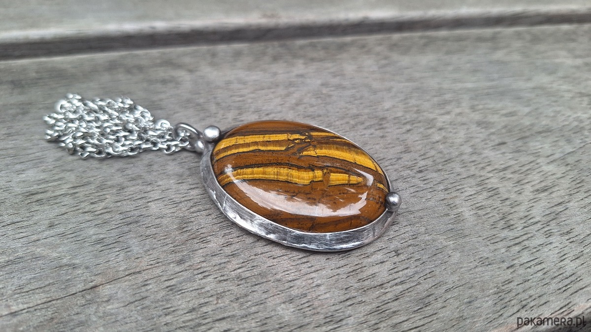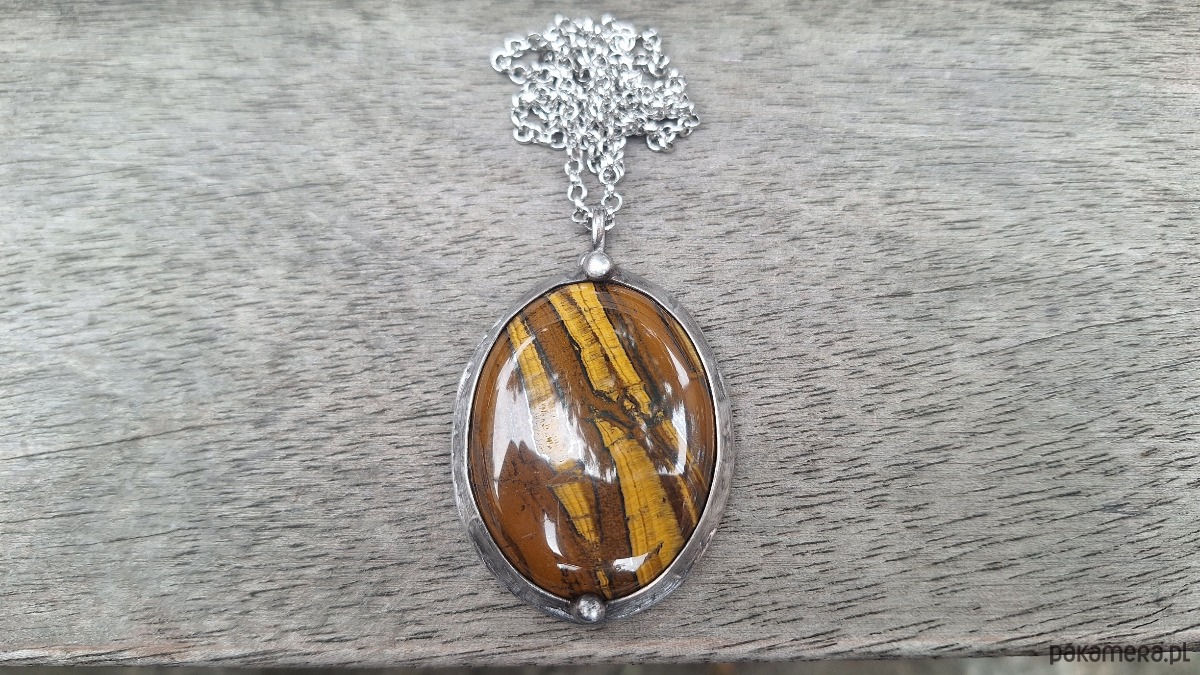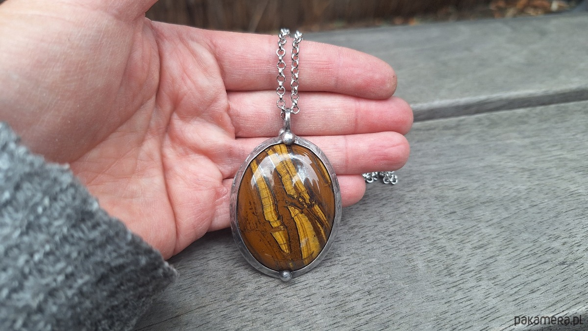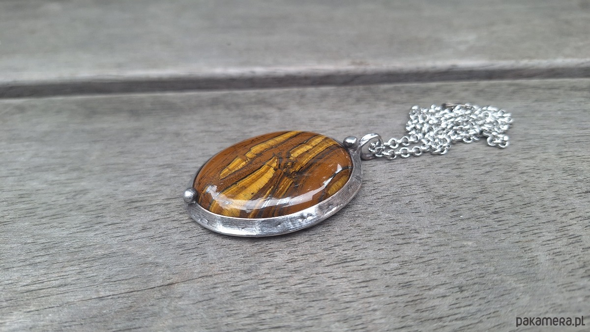 Wisiorek wykonany z miedzi, cyny i tygrysiego oka. Wymiary ok. 5 na 4 cm. Zawieszony na łańcuszku o długości ok. 50 cm.