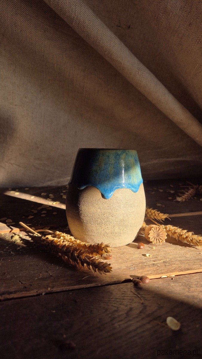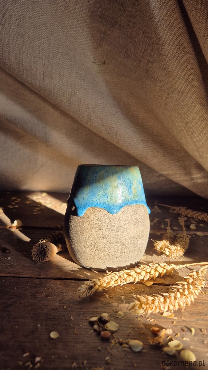 Toczona na kole z gliny BETON czarka, tykwa ceramiczna do parzenia naparu Yerba Mate. Bardzo duża 450 ml. Świetnie utrzymuje ciepło. Surowa glina w połączeniu z niebieskim płynącym szkliwem tworzy niesamowity efekt. Niepowtarzalne naczynie do Yerby, w którym rytuał picia Yerby wejdzie na inny level. Można myć w zmywarce!