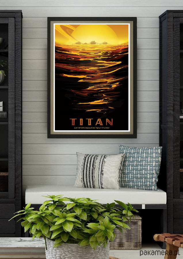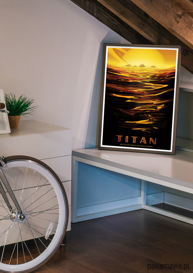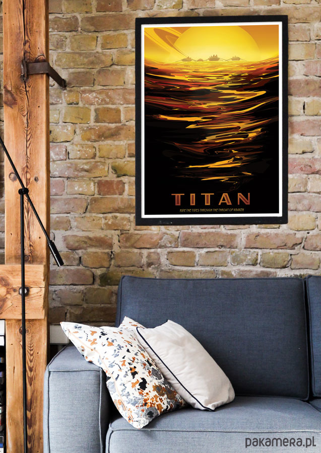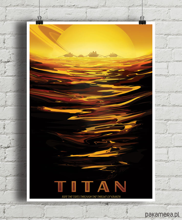 Plakat w stylu vintage przedstawiający Tytana - największy księżyc Saturna. Slogan na plakacie zachęca, by udać się w rejs przez "gardło Krakena". Tytan - tajemniczy, mroczny, mglisty księżyc przypominający naszą planetę sprzed biliona lat. Największy z 82 odkrytych księżyców Saturna. Jego powierzchnia ukształtowana przez jeziora i rzeki ciekłego metanu, skąpana jest w delikatnym świetle, które dociera tu tylko w 1% w porównaniu ze światłem docierającym na Ziemię.