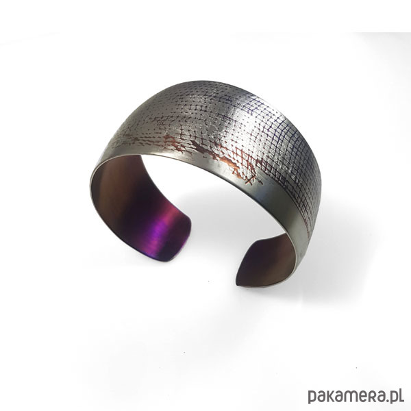 Bransoleta wykonana ręcznie z anodowanego tytanu. Szerokość 3,5 cm a w obwodzie 20,5 cm ale mogę wykonać mniejszą lub większą.Jest wygodna i trwała. Opatrzona podpisem autora