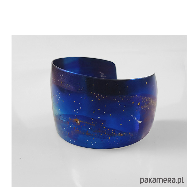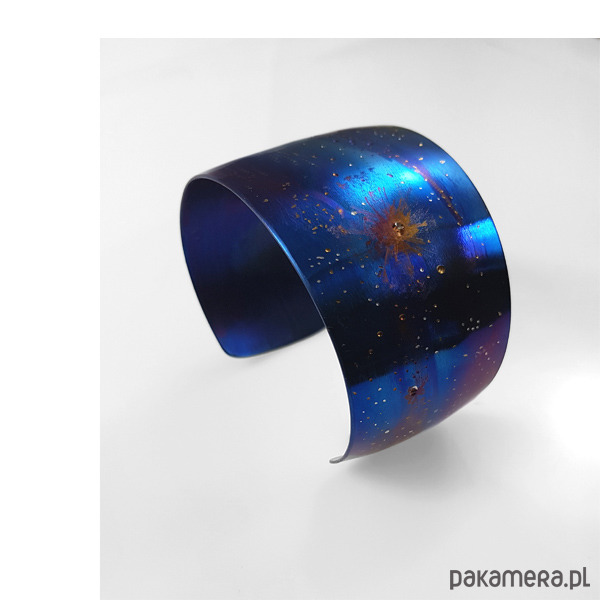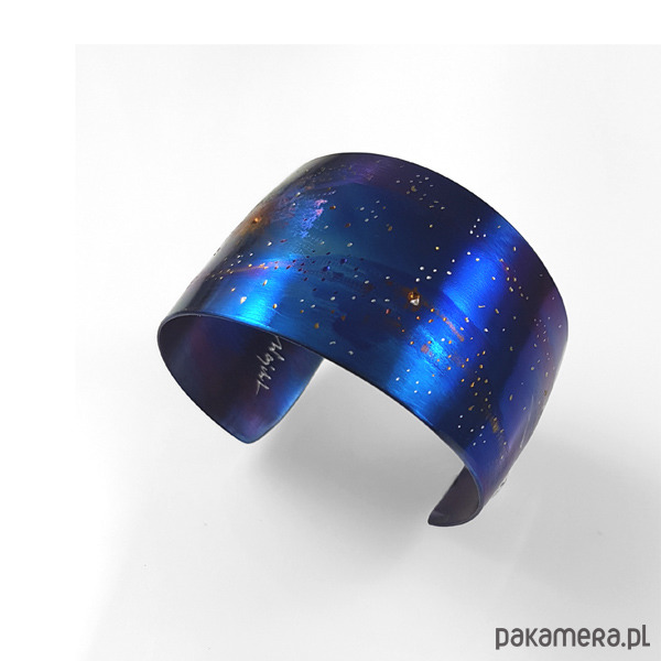 Bransoleta wykonana ręcznie z anodowanego tytanu. Szerokość 3,5 cm a w obwodzie 21cm ale mogę wykonać mniejszą lub większą.Jest wygodna i trwała. Opatrzona podpisem autora