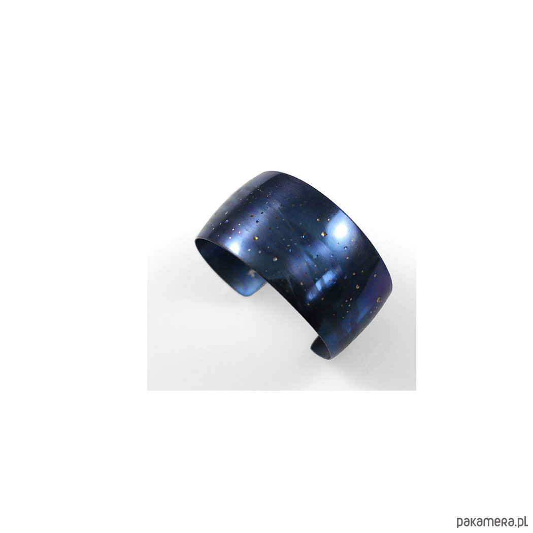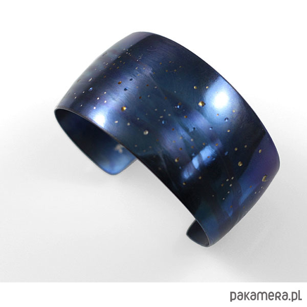 Bransoleta wykonana ręcznie z anodowanego tytanu. Szerokość 3,5 cm a w obwodzie 18,5 cm ale mogę wykonać mniejszą lub większą.Jest wygodna i trwała. Opatrzona podpisem autora