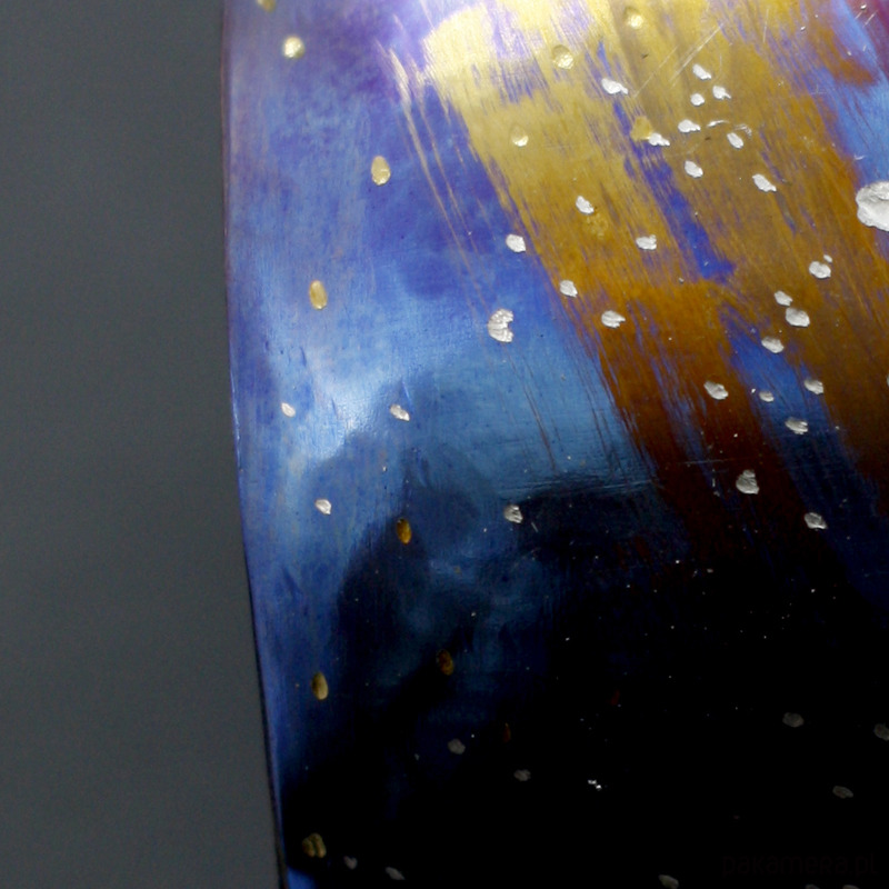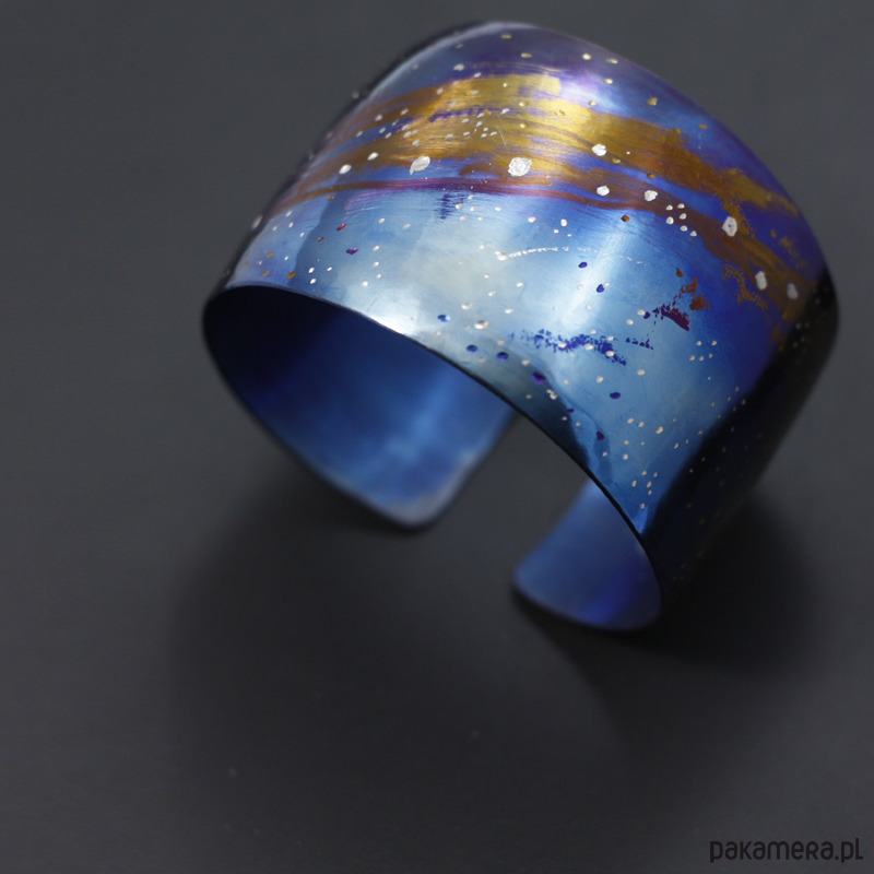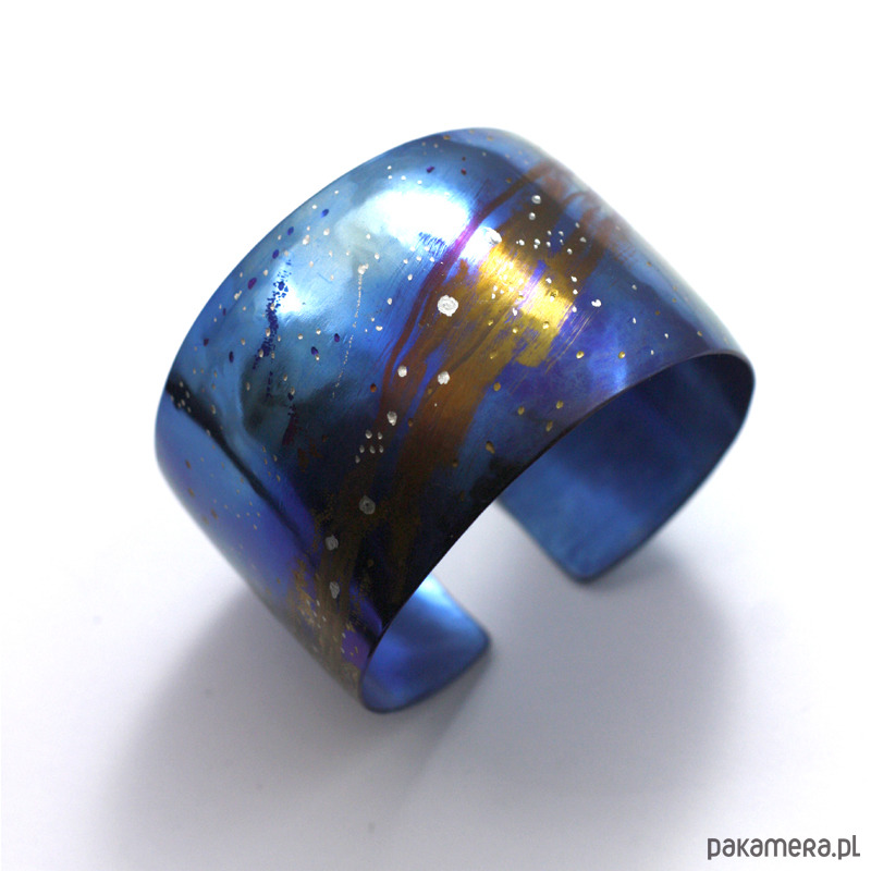 Bransoleta wykonana ręcznie z anodowanego tytanu. Szerokość 5 cm a w obwodzie 23 cm ale mogę wykonać mniejszą lub większą. Jest wygodna i trwała. Opatrzona podpisem autora