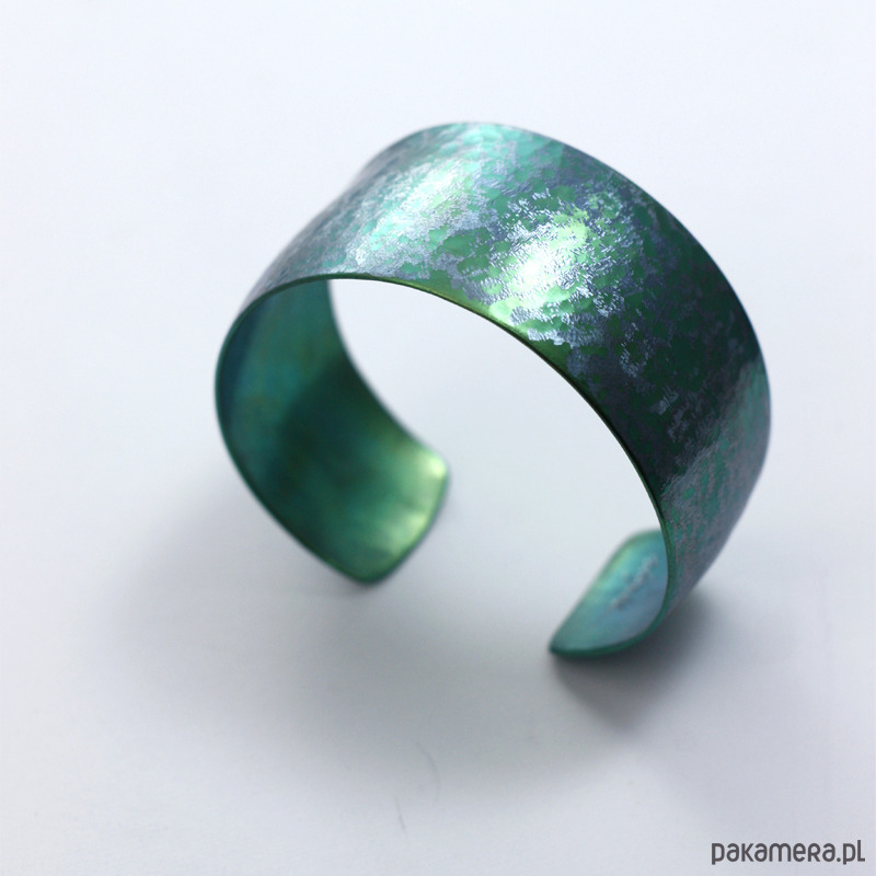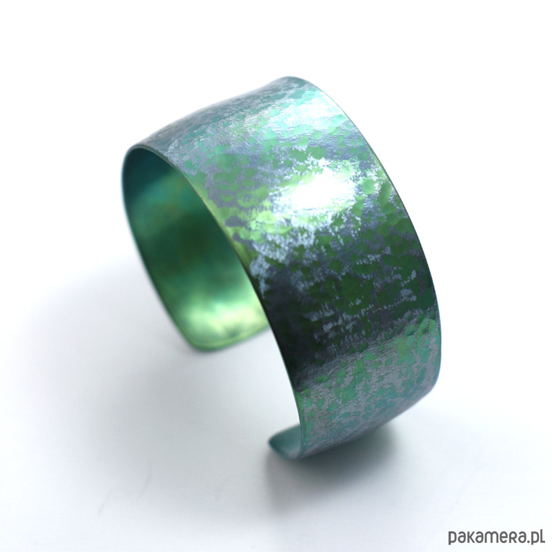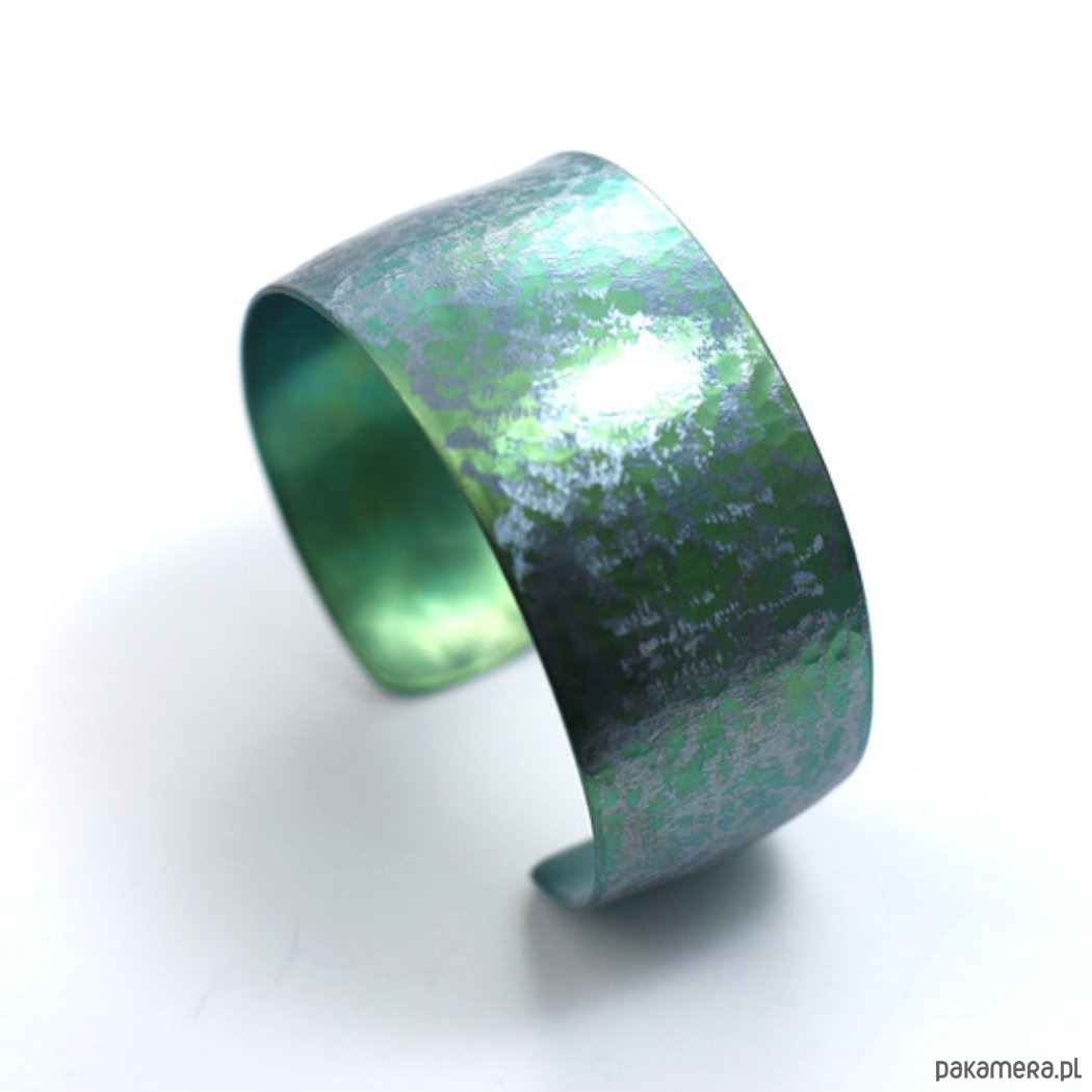 Bransoletkę wykonałem w całości ręcznie z anodowanego tytanu. Szerokość 3 cm a w obwodzie 21cm ale mogę wykonać mniejszą lub większą ,nieznacznie różniącą się od tej na zdjęciach. Jest wygodna i trwała. Opatrzona podpisem autora. Tytan jest niezwykle lekkim i trwałym metalem który nie wywołuje żadnych alergii-jest hipoalergiczny-stosowany w chirurgii i stomatologii. Odporny na działanie chemikaliów. Anodowany pokrywa się tlenkami o intensywnych kolorach które zachowują swą barwę przez wiele lat.