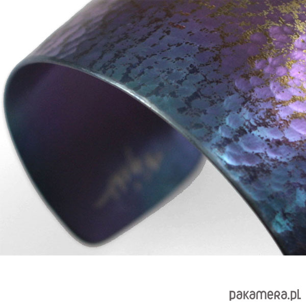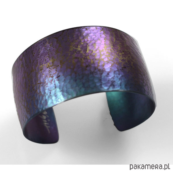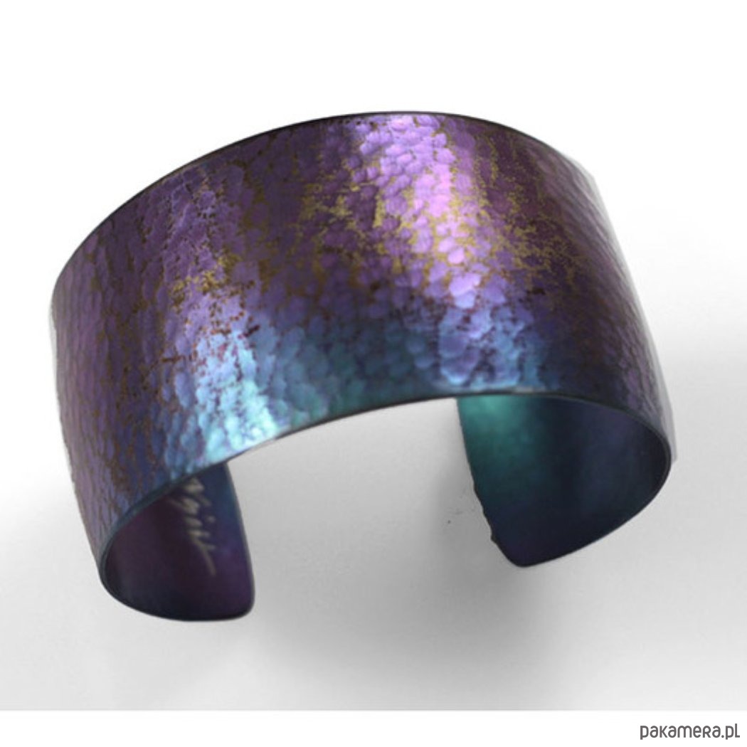 Bransoleta wykonana ręcznie z anodowanego tytanu. Szerokość 3,5 cm a w obwodzie 18,5 cm ale mogę wykonać mniejszą lub większą.Jest wygodna i trwała. Opatrzona podpisem autora