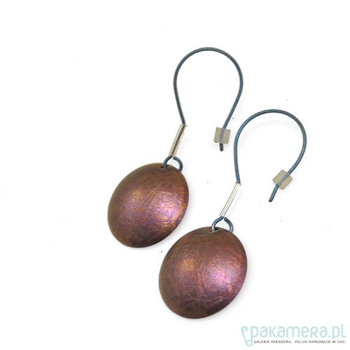 Kolczyki w całości zrobione ręcznie z anodowanego i satynowanego tytanu.Kolczyki razem z biglami mają długość 4,5 cm i średnicy 2,0 cm.Na odwrocie sygnowane wygrawerowanym autografem.