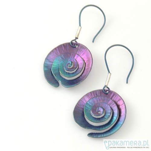 Kolczyki w całości zrobione ręcznie z anodowanego i repusowanego tytanu.Kolczyki razem z biglami mają długość 4,5 cm i średnicy 2,3 cm.Na odwrocie sygnowane wygrawerowanym autografem.