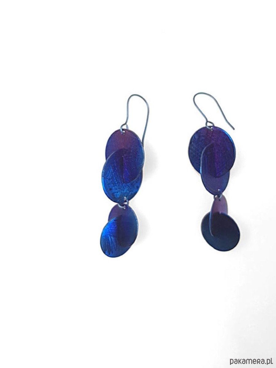 Kolczyki zrobiłem z tytanu .Są w kształcie kół o średnicy 2,0/18 cm.W całości mają długość ok 6,0 cm.Zapięciem jest tytanowa zawieszka. Na odwrocie sygnowane wygrawerowanym odręcznym podpisem.Bardzo lekkie.
