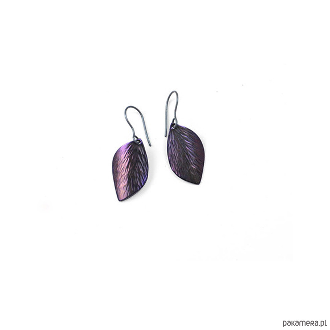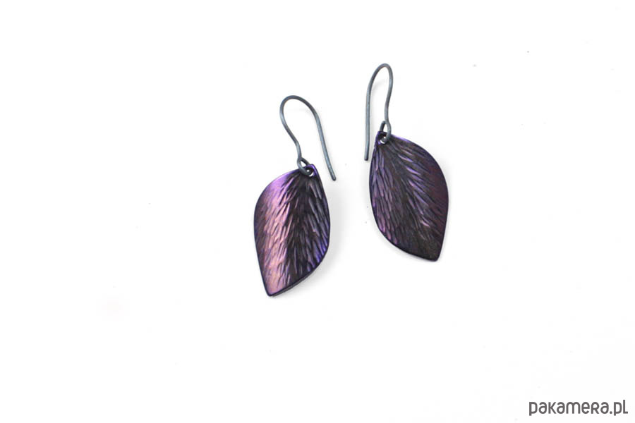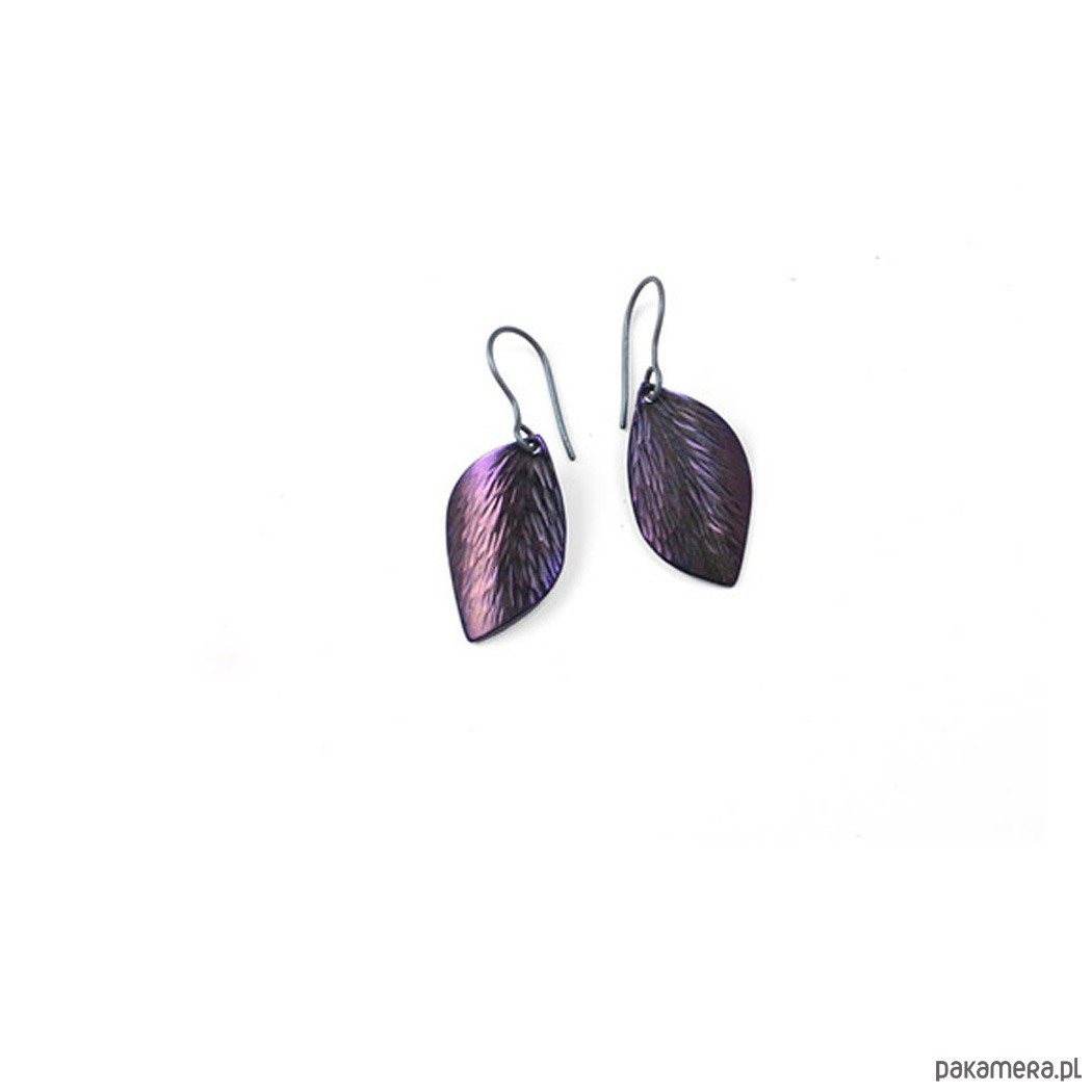 Kolczyki w kształcie listków zrobiłem ręcznie w całości z tytanu.Powierzchnia mieni się odcieniami filetu,niebieskiego.Kolczyki razem z zawieszką są dł.4,0 cm i szer.1,5 cm. Sygnowane na odwrocie wygrawerowanym autografem.Tytan jest niezwykle lekkim i trwałym metalem który nie wywołuje żadnych alergii-jest hipoalergiczny-stosowany w chirurgii i stomatologii. Odporny na działanie chemikaliów.