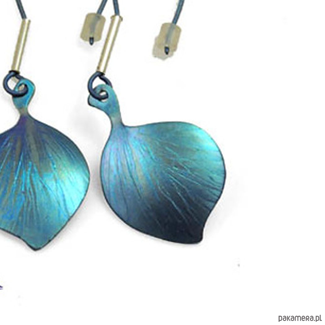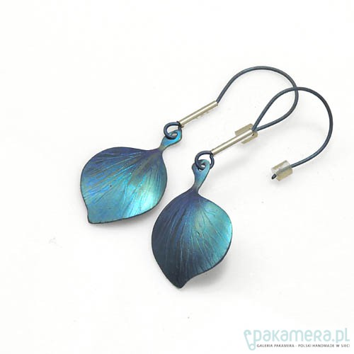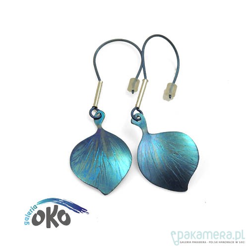 Kolczyki wykonane z hipoalergicznego tytanu.Wyjątkowo lekkie.Długość z biglami 5 cm a szerokość listka 1,7 cm.Na odwrocie sygnowane wygrawerowanym podpisem.