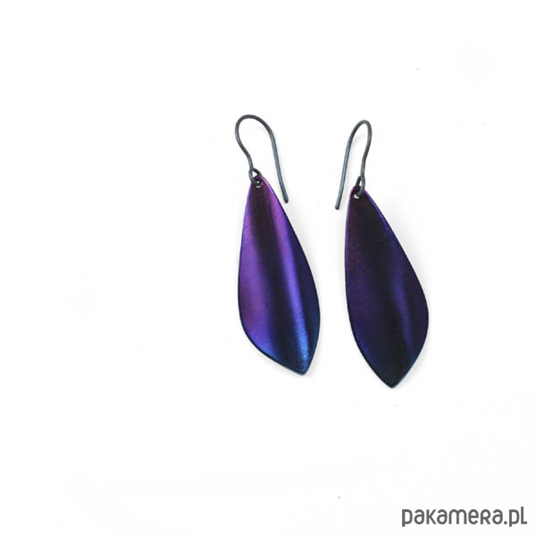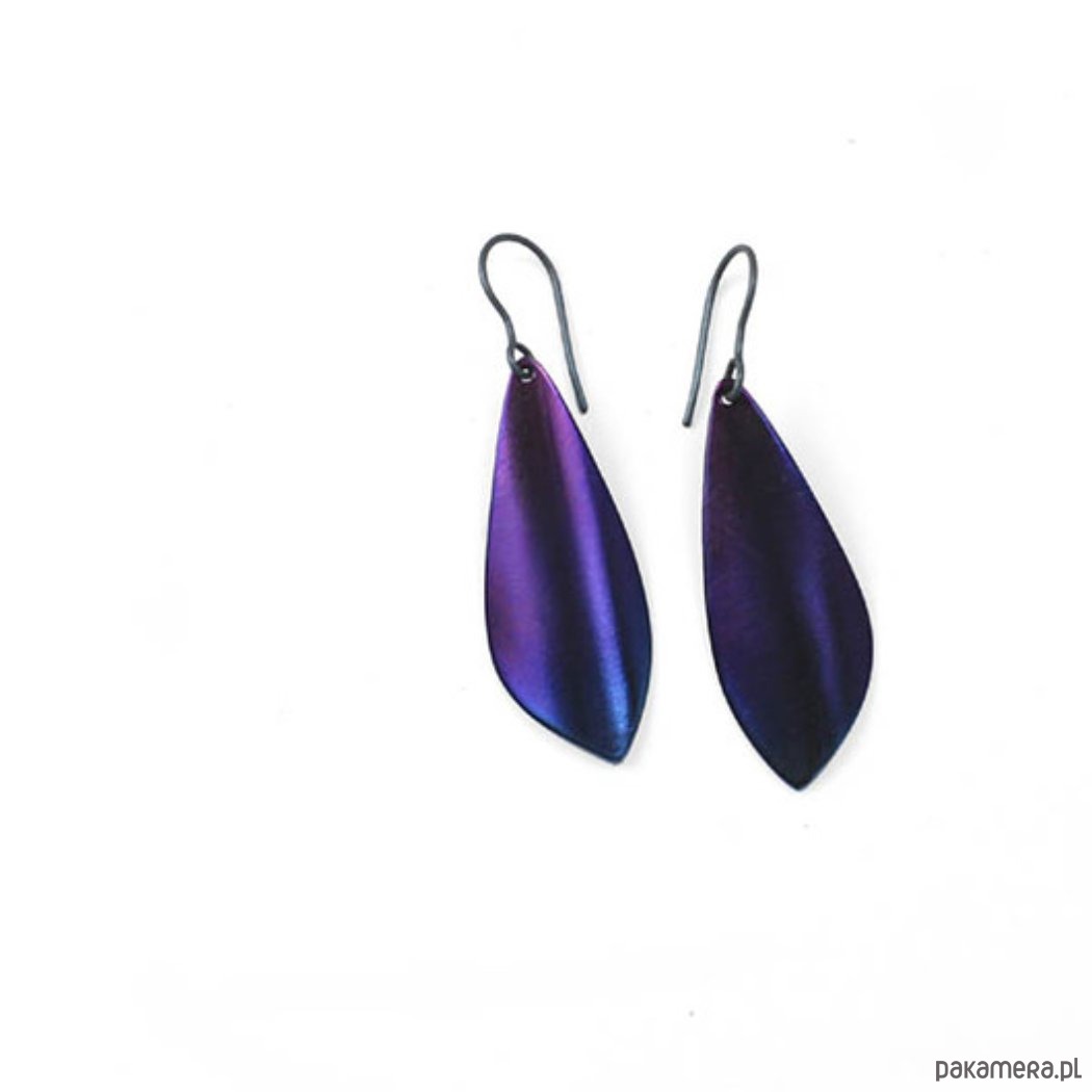 Kolczyki w kształcie listków zrobiłem ręcznie w całości z tytanu.Powierzchnia mieni się odcieniami filetu,niebieskiego.Kolczyki razem z zawieszką są dł.5,3 cm i szer.1,5 cm. Sygnowane na odwrocie wygrawerowanym autografem.Tytan jest niezwykle lekkim i trwałym metalem który nie wywołuje żadnych alergii-jest hipoalergiczny-stosowany w chirurgii i stomatologii. Odporny na działanie chemikaliów.
