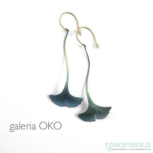 Kolczyki w kształcie liści miłorzębu wykonałem z anodowanego tytanu.Kolczyki są niezwykle lekkie.Wraz z tytanową,nieuczulającą zawieszką mają długość 7,4 cm a listek jest szerokości 2,8cm.Na odwrocie sygnowane są wygrawerowanym autografem.