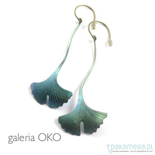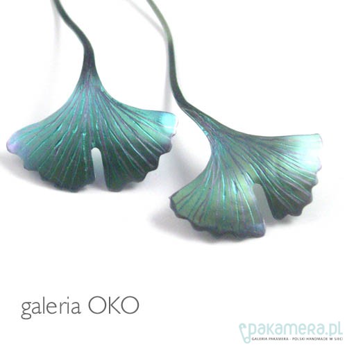 Kolczyki w kształcie liści miłorzębu wykonałem z anodowanego tytanu.Kolczyki są niezwykle lekkie.Wraz z tytanową,nieuczulającą zawieszką mają długość 7,4 cm a listek jest szerokości 2,8cm.Na odwrocie sygnowane są wygrawerowanym autografem.