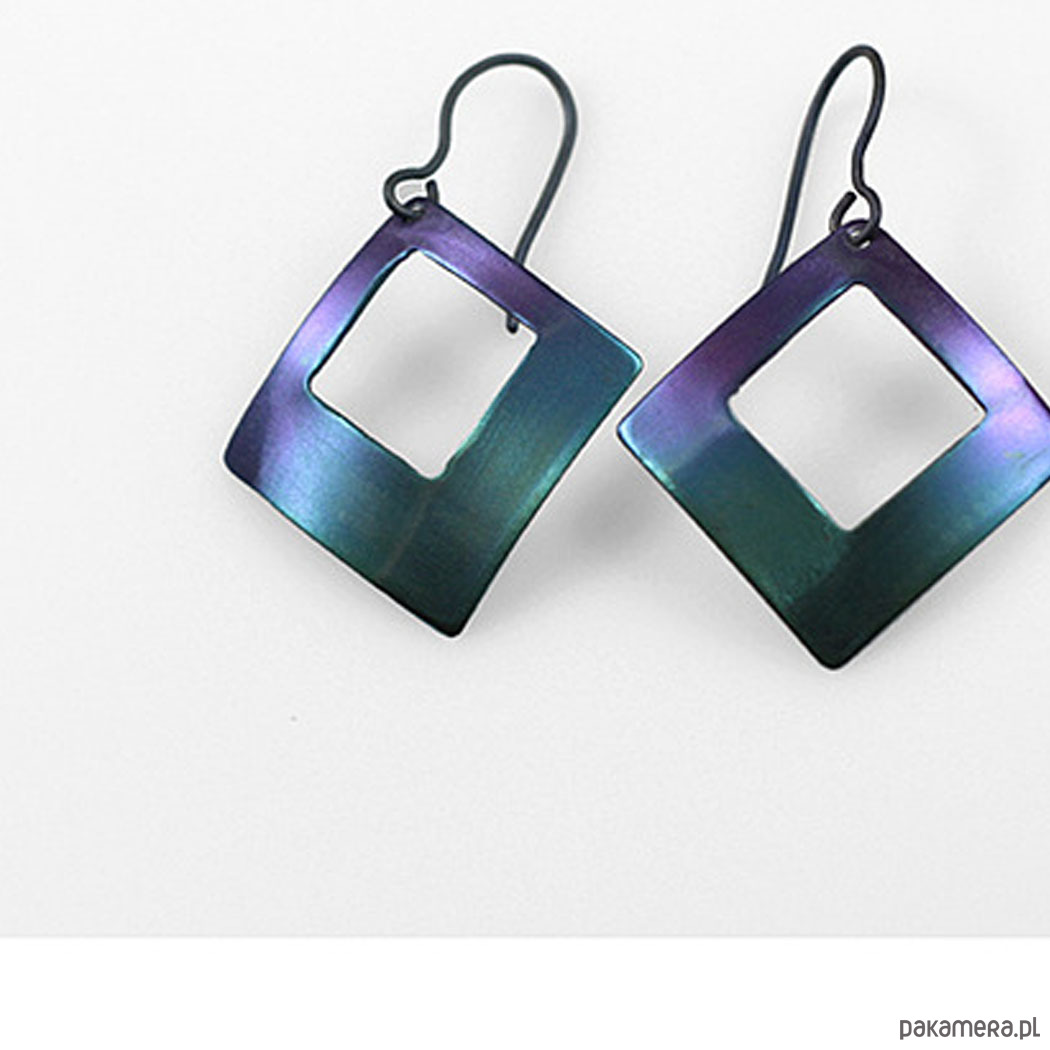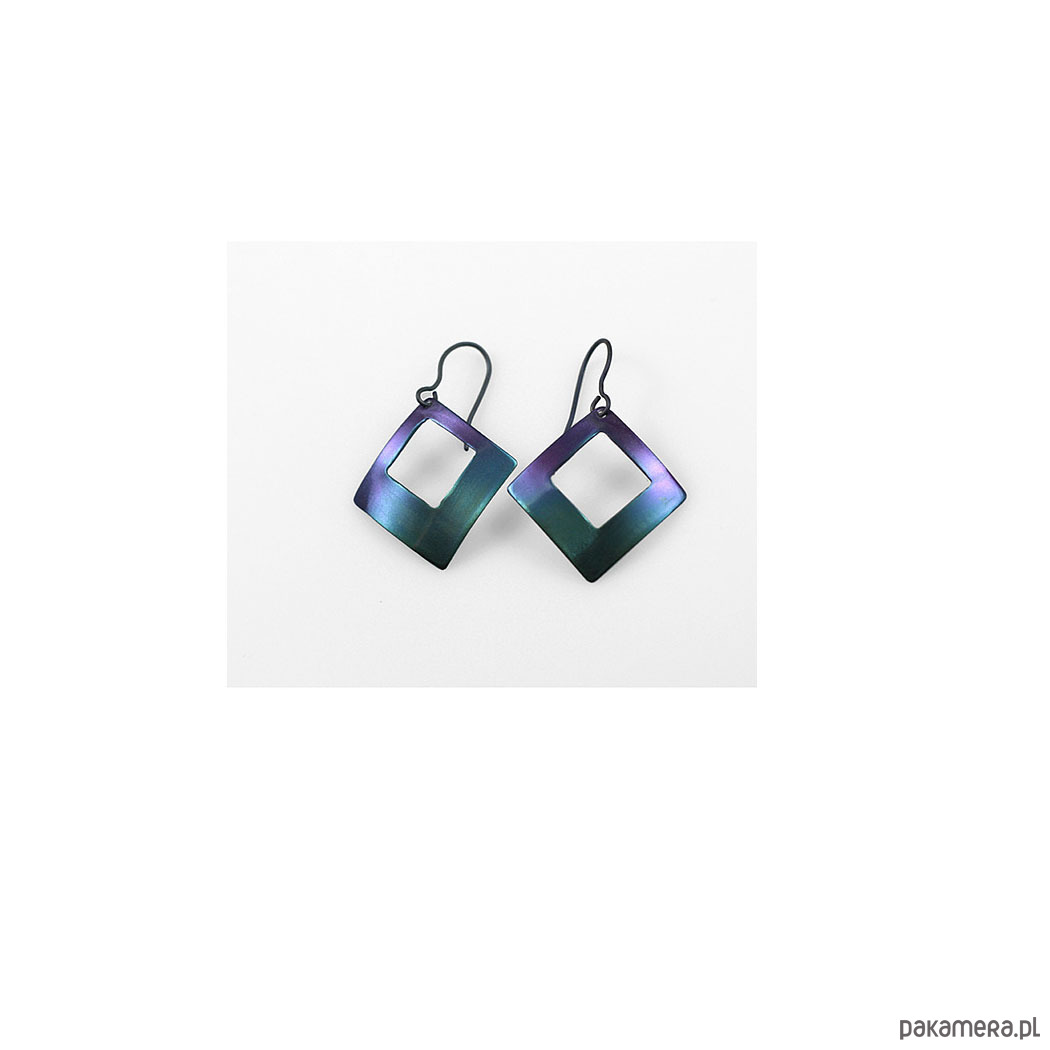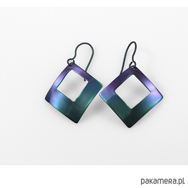 Kolczyki zrobiłem z tytanu .Są w kształcie rombów o bokach 2,0 cm.W całości mają długość 4,5 cm.Zapięciem jest srebrny sztyft. Na odwrocie sygnowane wygrawerowanym odręcznym podpisem.Bardzo lekkie.
