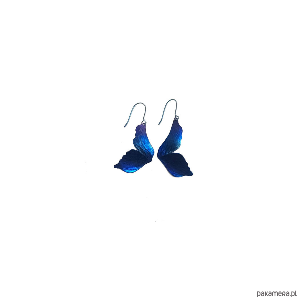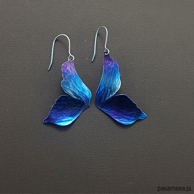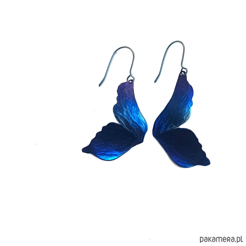 Kolczyki w kształcie skrzydeł motyla zrobiłem w całości ręcznie z tytanu.Repusowana ,kolorowa powierzchnia odbija światło tworząc ciekawe efekty.Kolczyki są niezwykle lekkie choć są wielkości ; szerokość 2.3 cm i długości 4.8 cm a zawieszką -też z tytanu- 5.5 cm.