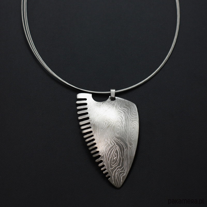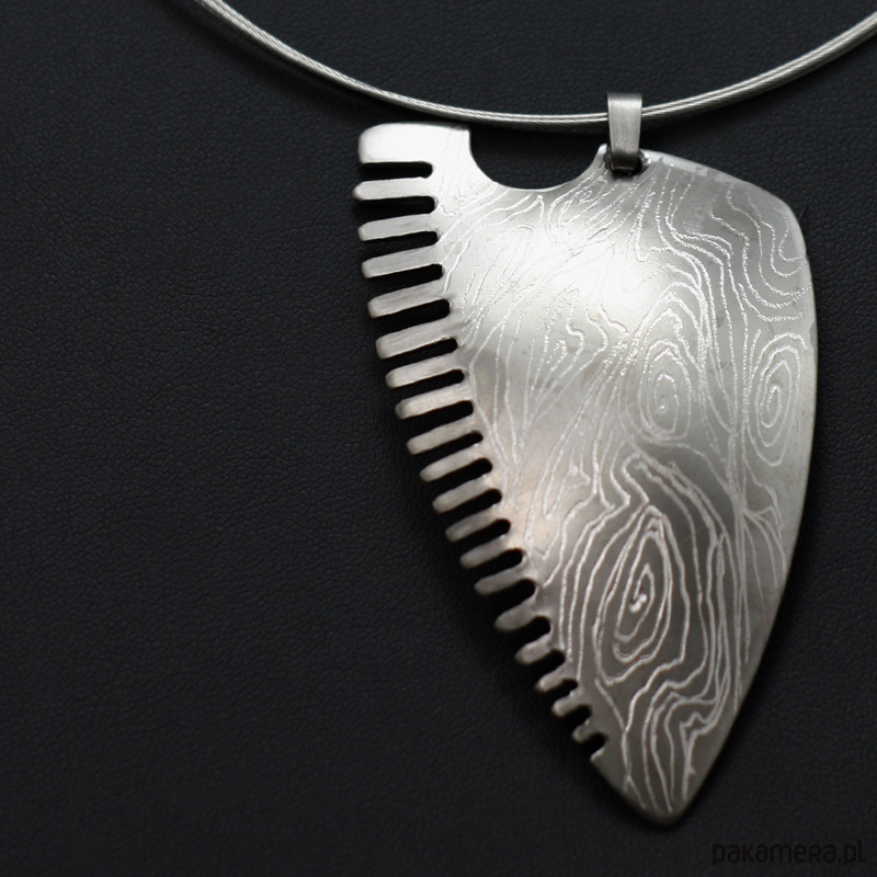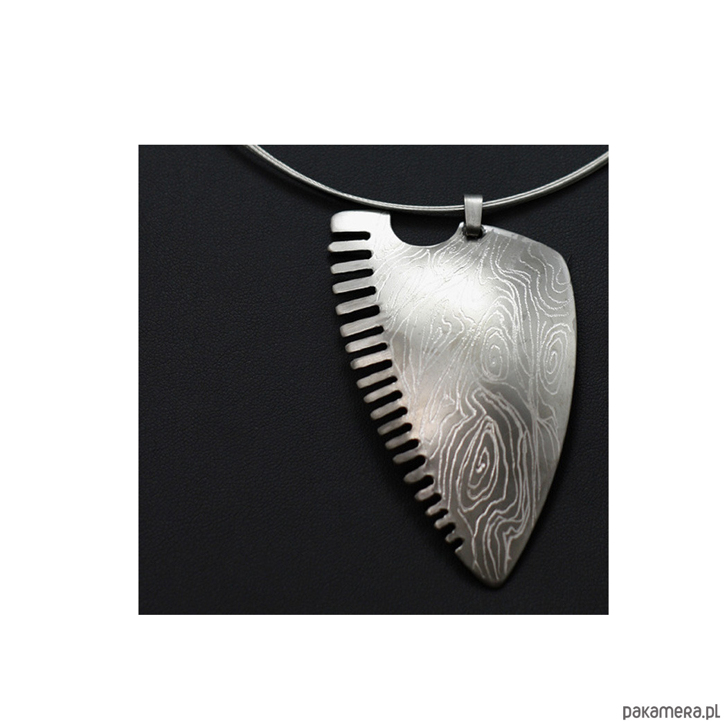Wisiorek wykonałem z tytanu .Zawieszka jest wielkości ;dł. 7,5 cm i szer. ok. 4,0 cm. Zawieszona na stalowych , jubilerskich linkach zakończonych srebrnym zapięciem. Długość koli to 44 cm ale może być inna według życzenia.