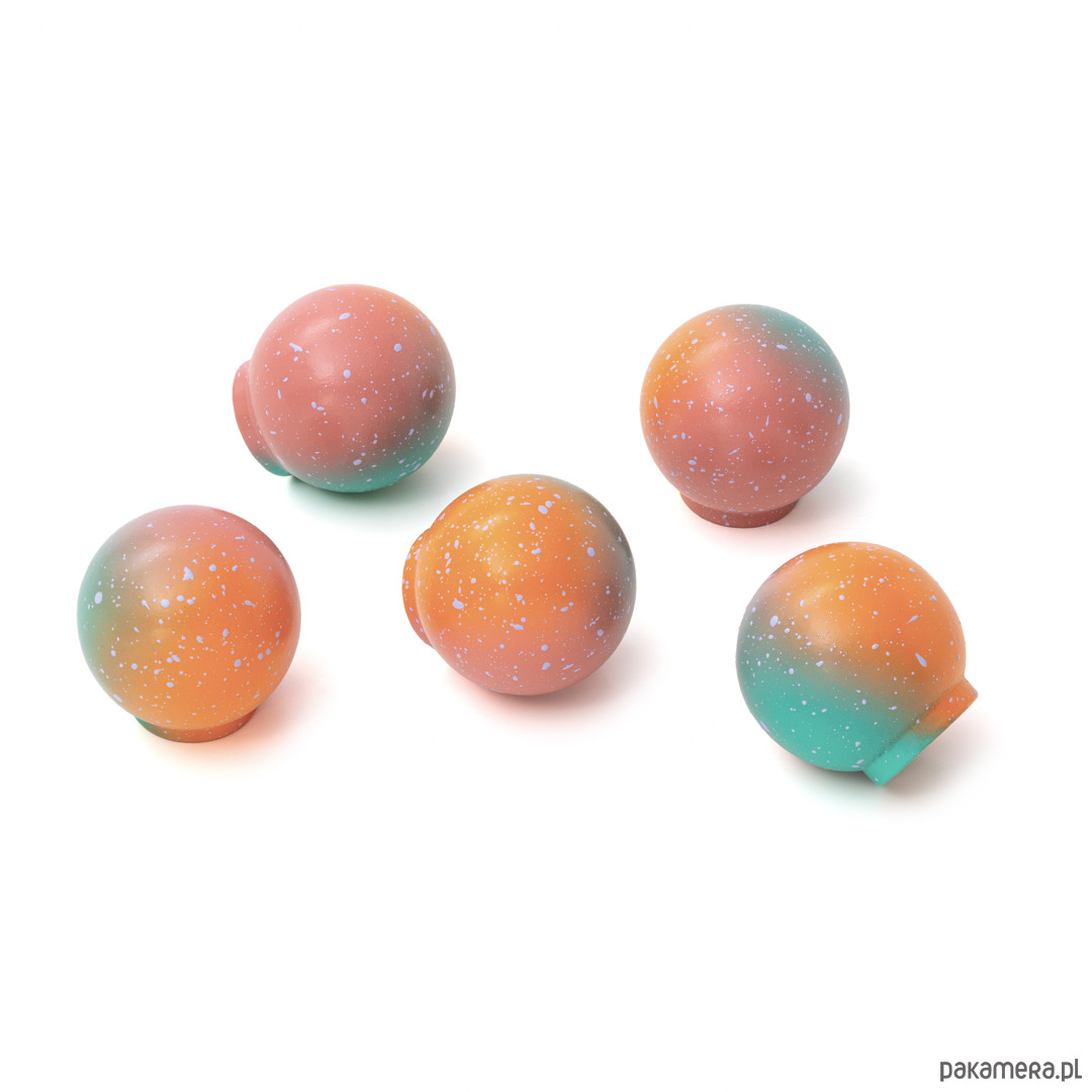 Gałka Ren z kolekcji Melange jest wariacją na temat chaosu, ale i harmonii. Na pierwszy rzut oka choć kompozycja kropek wydaje się chaotyczna to też pokrywając w pełni sferę kuli staję się harmonijnym jej wykończeniem. Kompozycja domknięta.