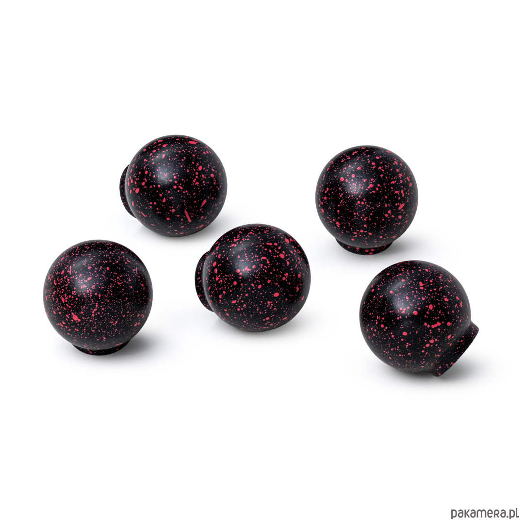 Gałka Ren z kolekcji Melange jest wariacją na temat chaosu, ale i harmonii. Na pierwszy rzut oka choć kompozycja kropek wydaje się chaotyczna to też pokrywając w pełni sferę kuli staję się harmonijnym jej wykończeniem. Kompozycja domknięta.
