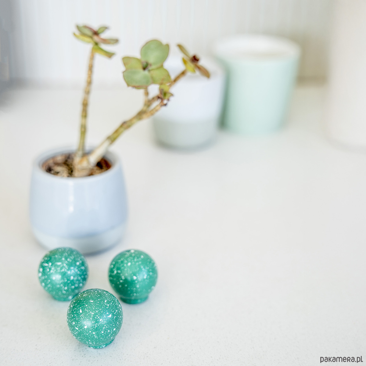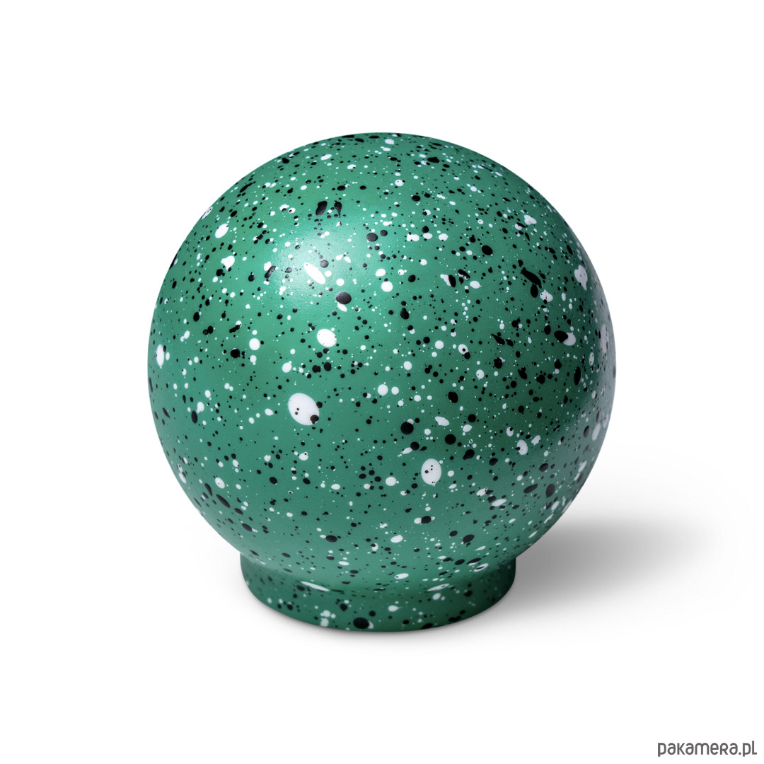 Gałka Ren z kolekcji Melange jest wariacją na temat chaosu, ale i harmonii. Na pierwszy rzut oka choć kompozycja kropek wydaje się chaotyczna to też pokrywając w pełni sferę kuli staję się harmonijnym jej wykończeniem. Kompozycja domknięta.