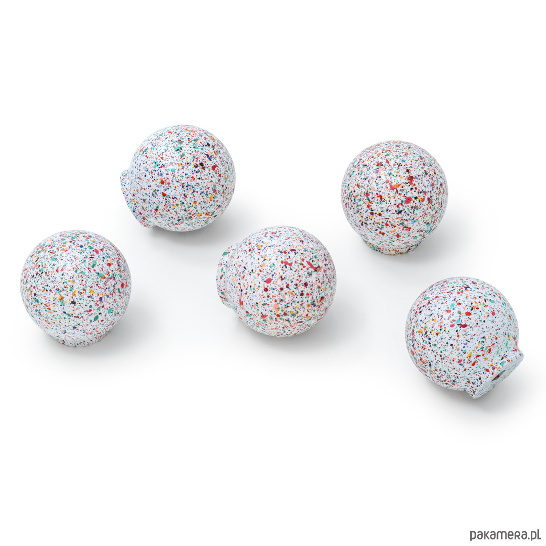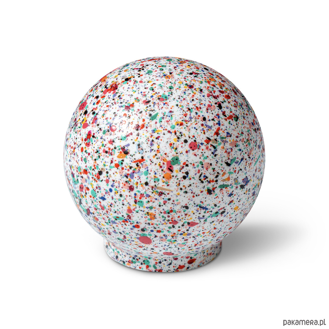 Eksplozja koloru zamknięta w perfekcyjnej kulistej formie. Ren Hiper Melange to najbardziej intensywny wzór z całej kolekcji – powierzchnia pokryta jest dynamiczną kompozycją aż trzynastu barw charakterystycznych dla palety vince design. Na śnieżnobiałym tle pojawiają się kropki, plamy i rozpryski w kontrastowych kolorach: od nasyconych czerwieni, fioletów i błękitów po żywe zielenie, oranże i żółcie.