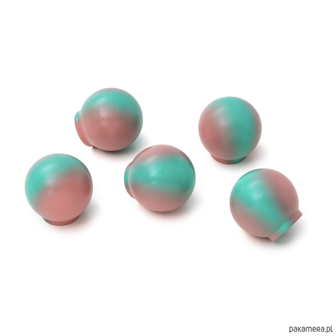 Gałka Ren z kolekcji Melange jest wariacją na temat chaosu, ale i harmonii. Na pierwszy rzut oka choć kompozycja kropek wydaje się chaotyczna to też pokrywając w pełni sferę kuli staję się harmonijnym jej wykończeniem. Kompozycja domknięta.