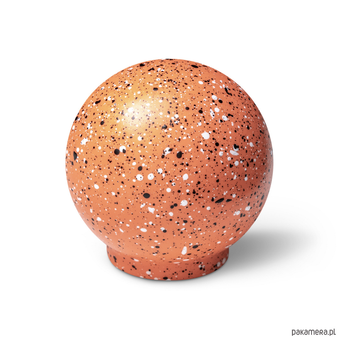 Gałka Ren z kolekcji Melange jest wariacją na temat chaosu, ale i harmonii. Na pierwszy rzut oka choć kompozycja kropek wydaje się chaotyczna to też pokrywając w pełni sferę kuli staję się harmonijnym jej wykończeniem. Kompozycja domknięta.