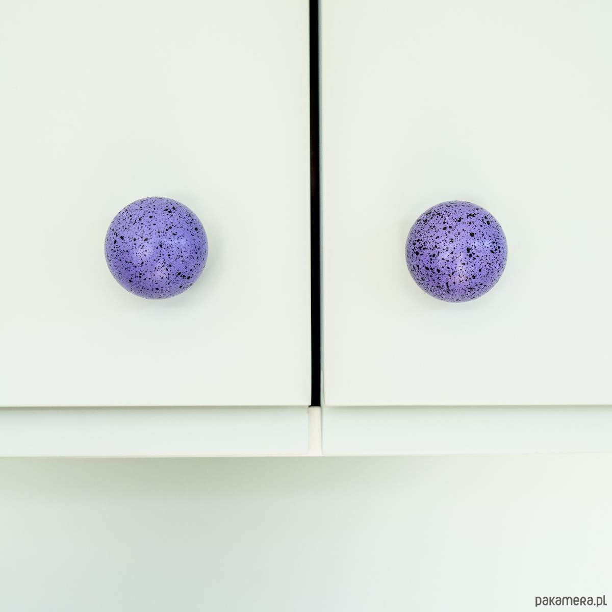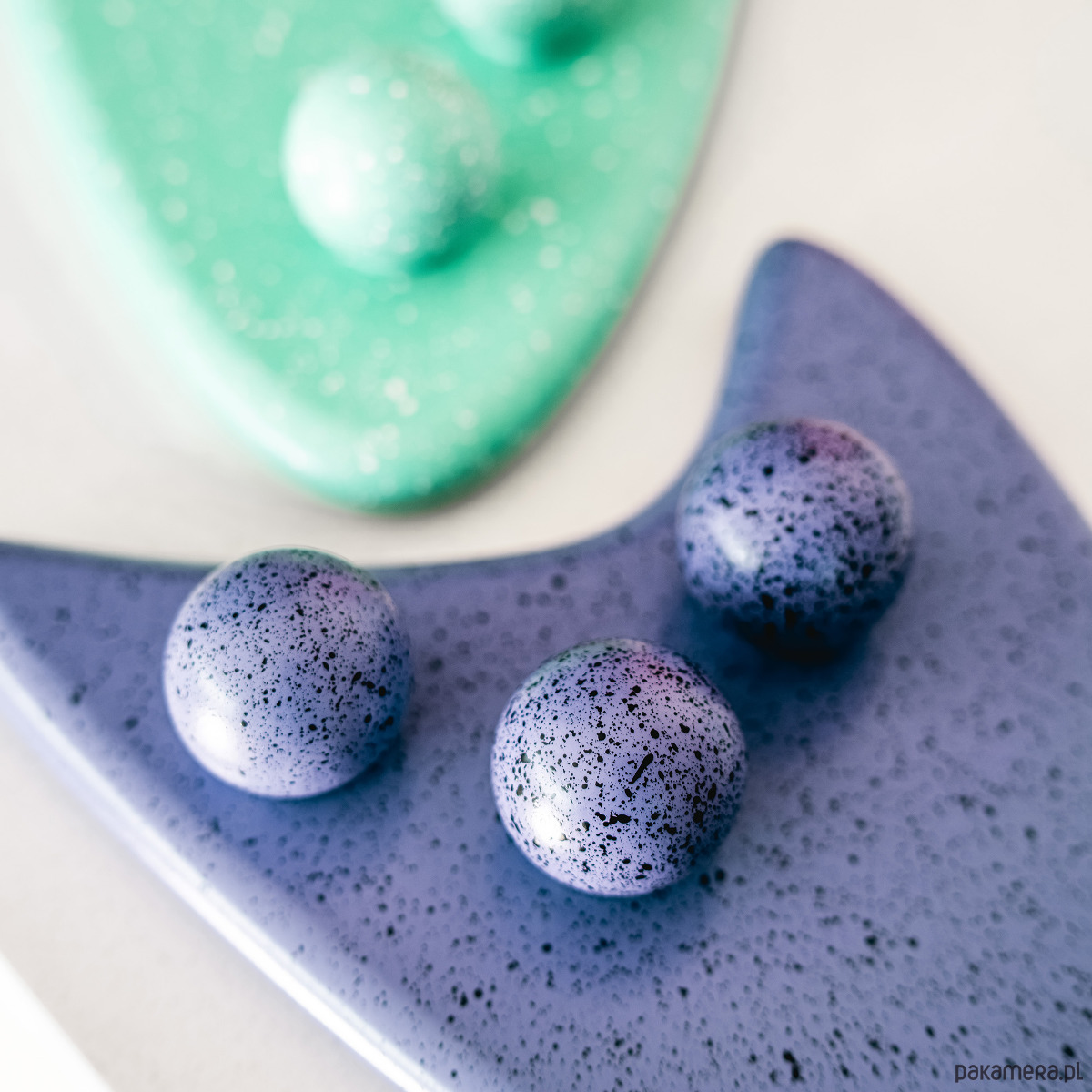 Gałka Ren z kolekcji Melange jest wariacją na temat chaosu, ale i harmonii. Na pierwszy rzut oka choć kompozycja kropek wydaje się chaotyczna to też pokrywając w pełni sferę kuli staję się harmonijnym jej wykończeniem. Kompozycja domknięta.