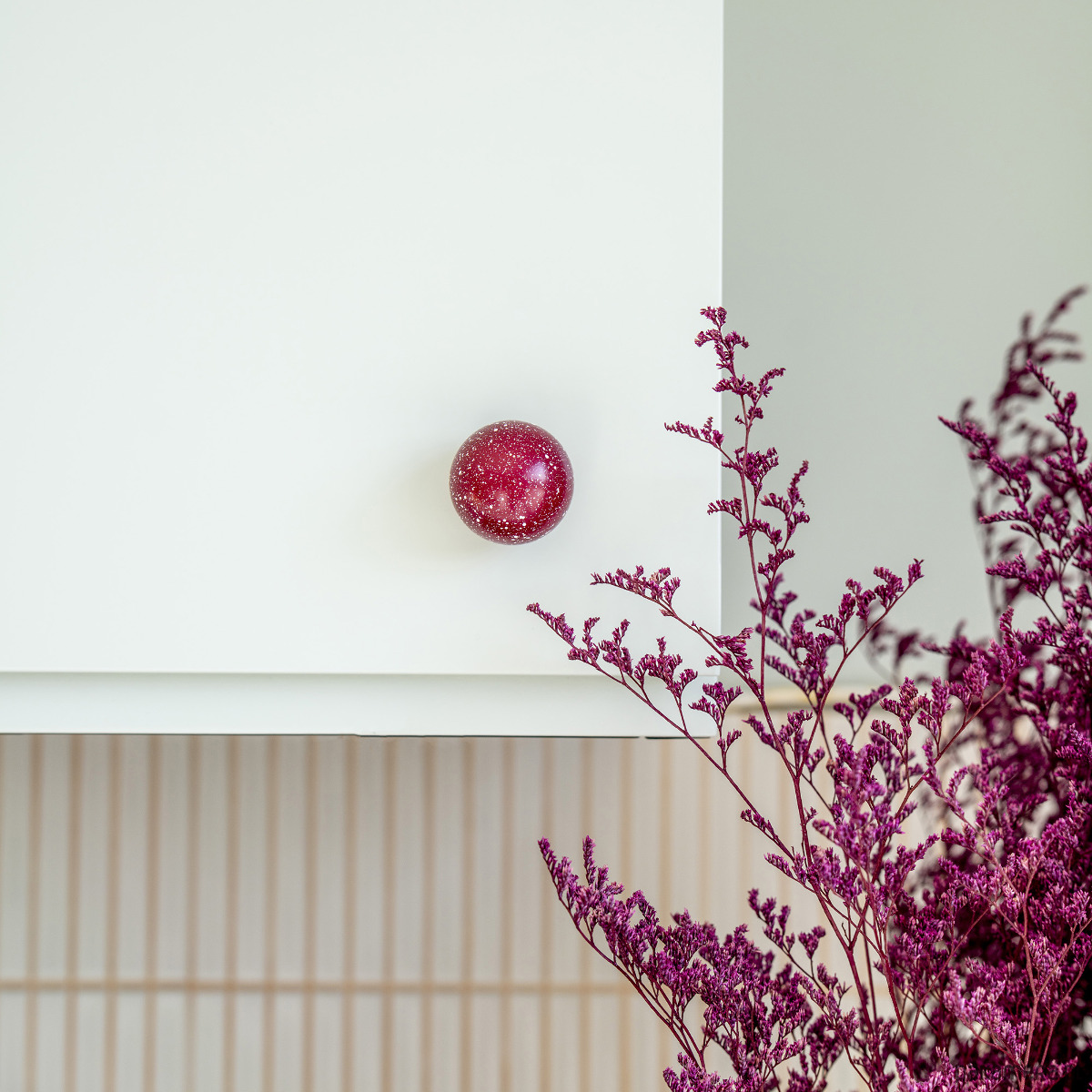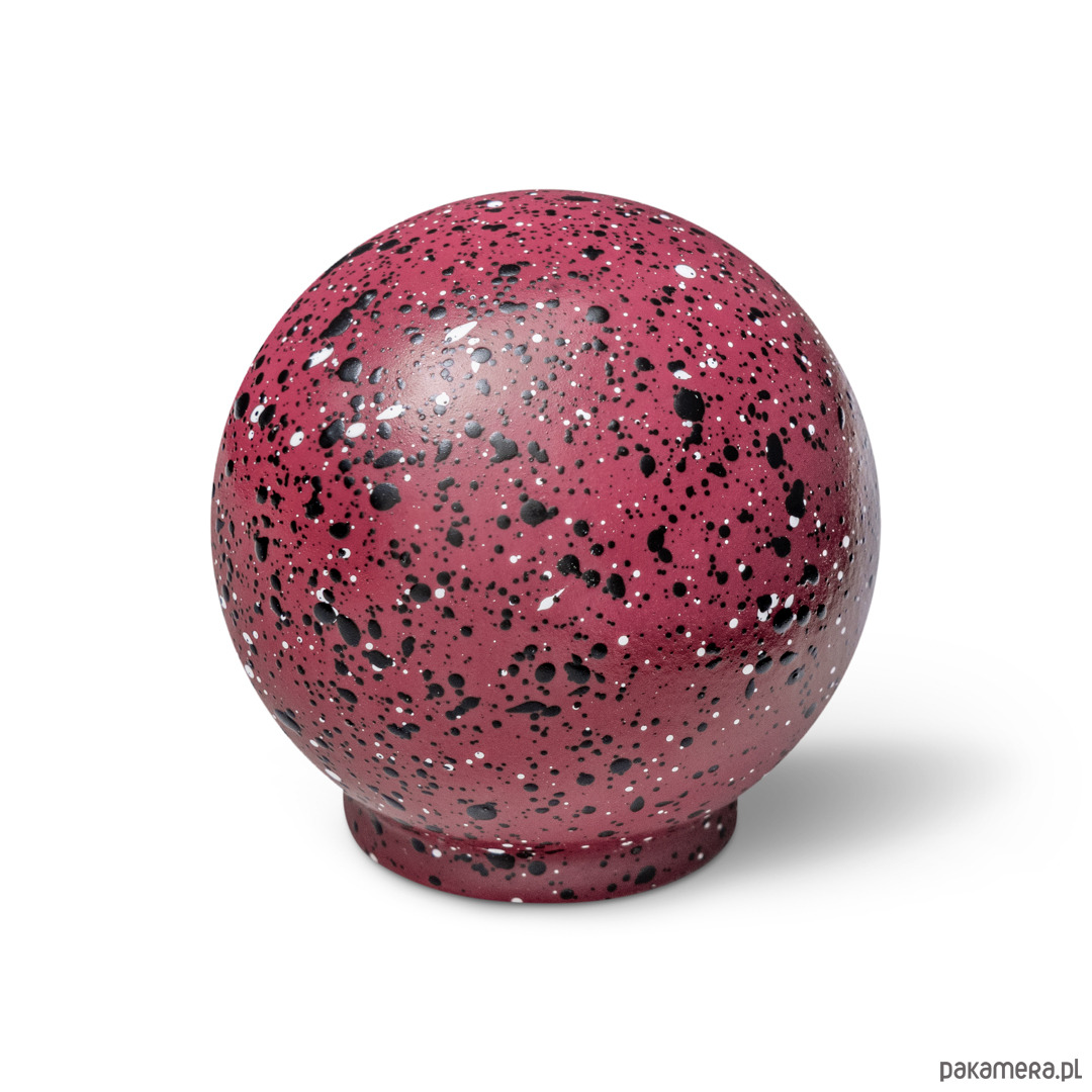 Gałka Ren z kolekcji Melange jest wariacją na temat chaosu, ale i harmonii. Na pierwszy rzut oka choć kompozycja kropek wydaje się chaotyczna to też pokrywając w pełni sferę kuli staję się harmonijnym jej wykończeniem. Kompozycja domknięta.