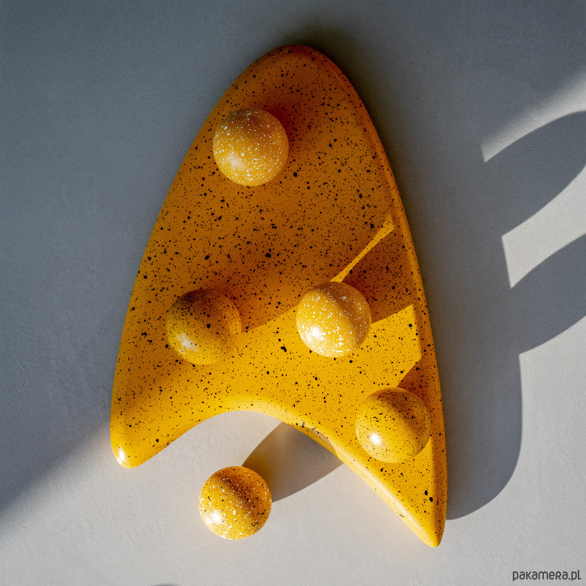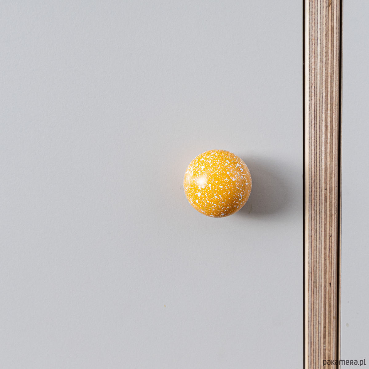 Gałka Ren z kolekcji Melange jest wariacją na temat chaosu, ale i harmonii. Na pierwszy rzut oka choć kompozycja kropek wydaje się chaotyczna to też pokrywając w pełni sferę kuli staję się harmonijnym jej wykończeniem. Kompozycja domknięta.
