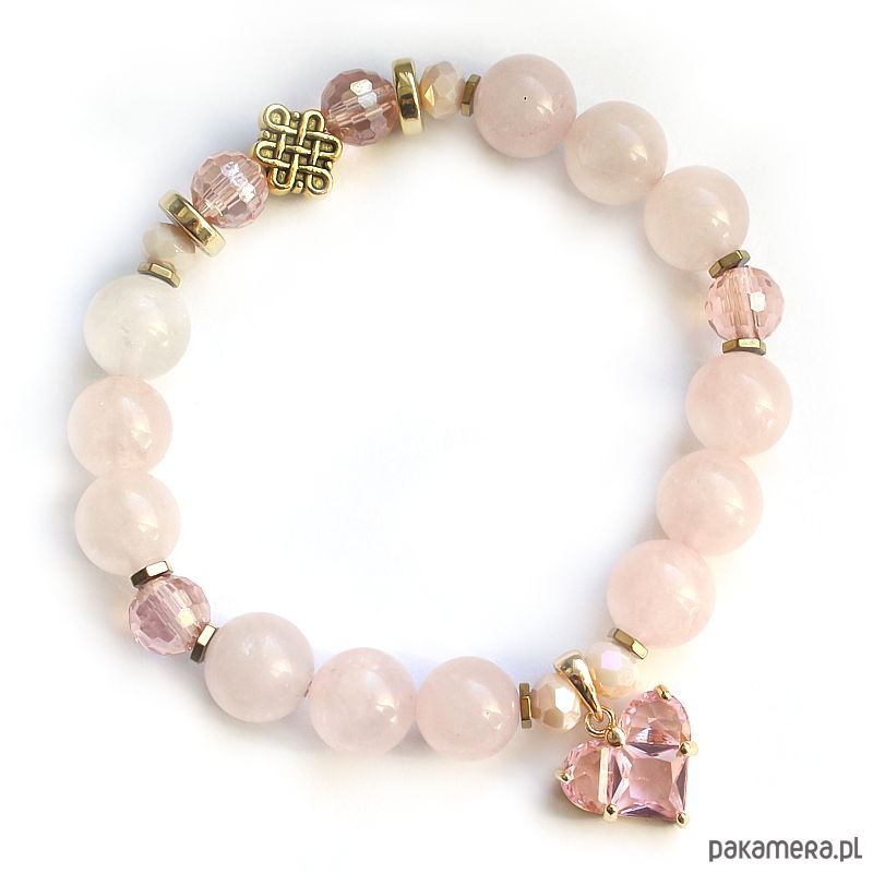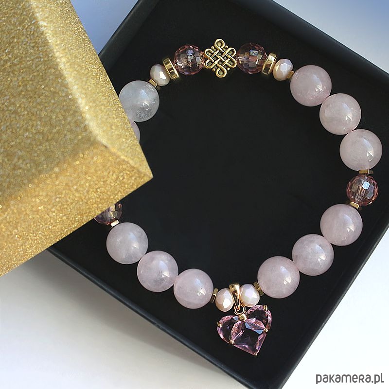 Elegancka energetyczna bransoletka z kwarcem różowym, efektowną zawieszką z serduszkiem, hematytami pozłacanymi 24k złotem oraz symbolem pomyślności. Oczyszczona, zregenerowana, napełniona energią czystego światła o najwyższej wibracji. ❤