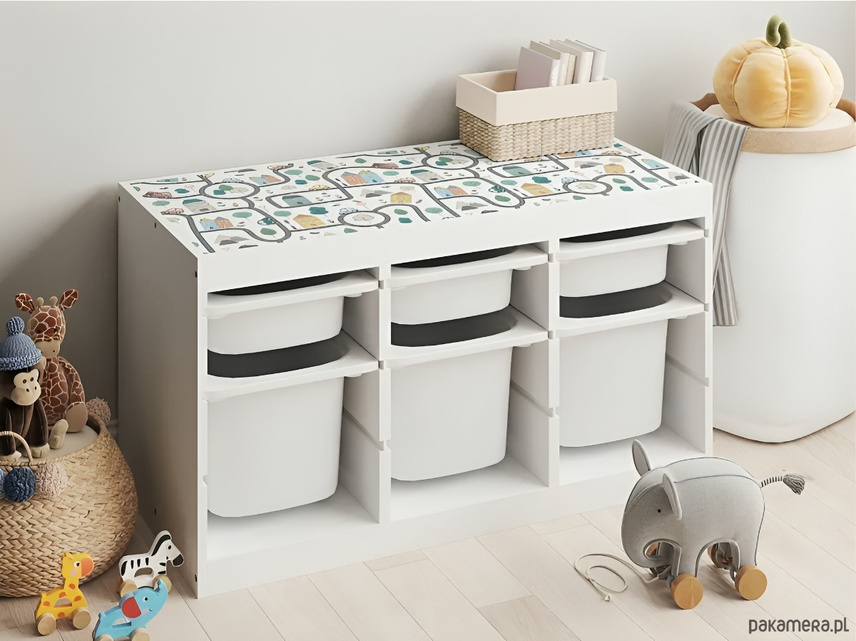Zmień swoje meble IKEA Trofast w wyjątkową wizytówkę dzięki naklejce na meble IKEA Trofast Dziecięca Miejskie Uliczki. Nasze laminowane naklejki winylowe są dostępne w tysiącach wzorów, od geometrycznych i kwiatowych po abstrakcyjne i wiele innych. Naklejki Trofast nie tylko nadają unikalny, spersonalizowany wygląd każdemu pomieszczeniu, ale są również doskonałym rozwiązaniem do odświeżenia mebli Trofast z Ikei. Dodaj swojemu wnętrzu niepowtarzalny charakter, przyklejając naklejki na blaty mebli dziecięcych IKEA.