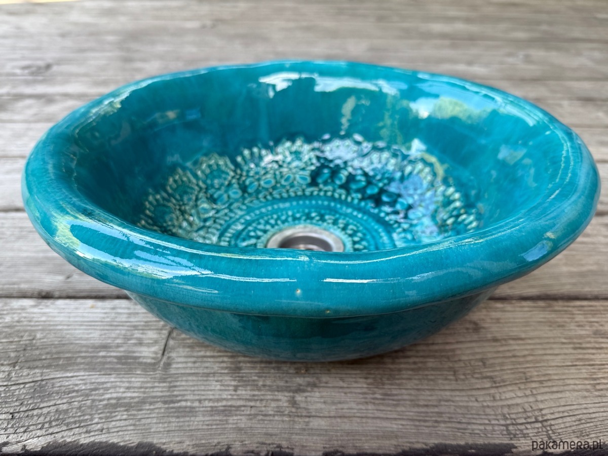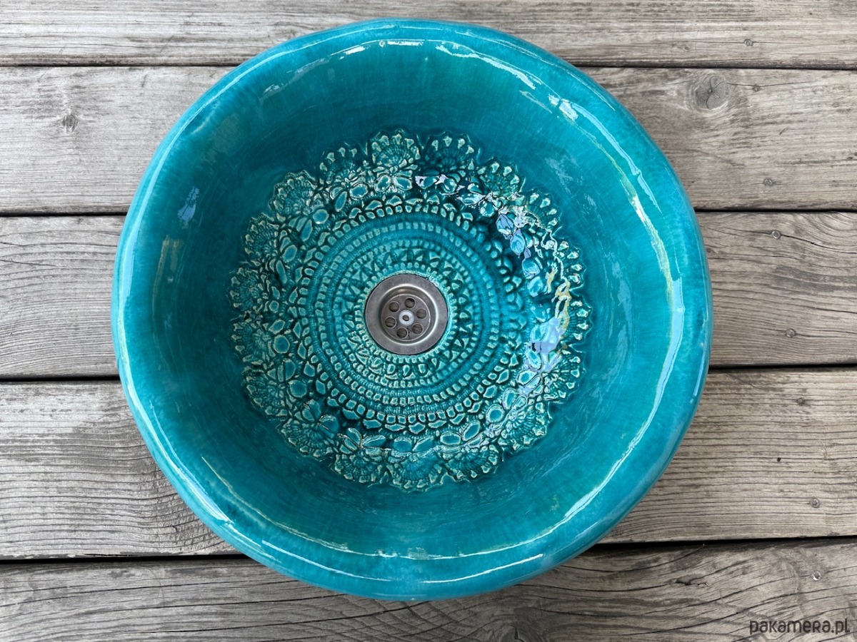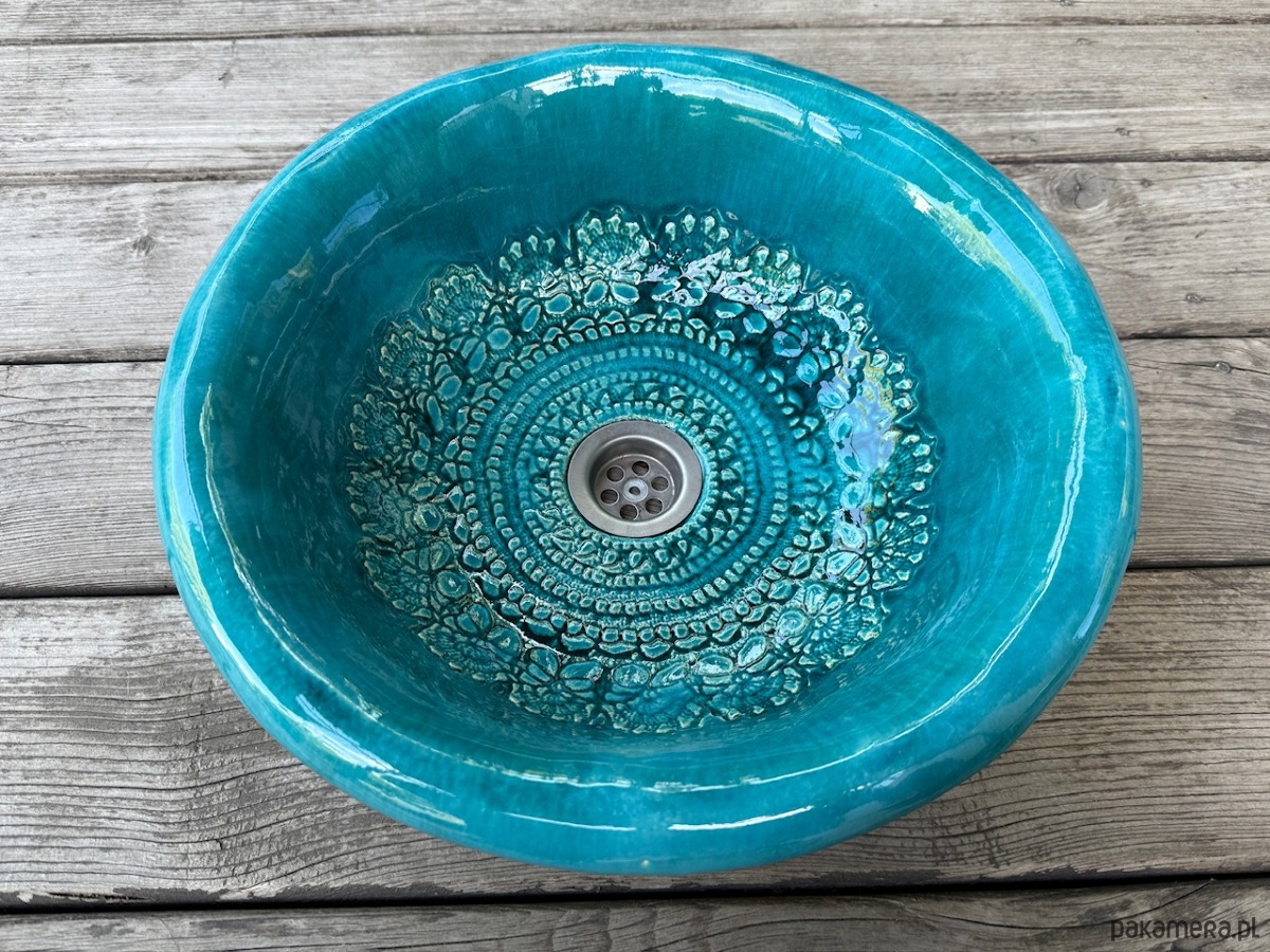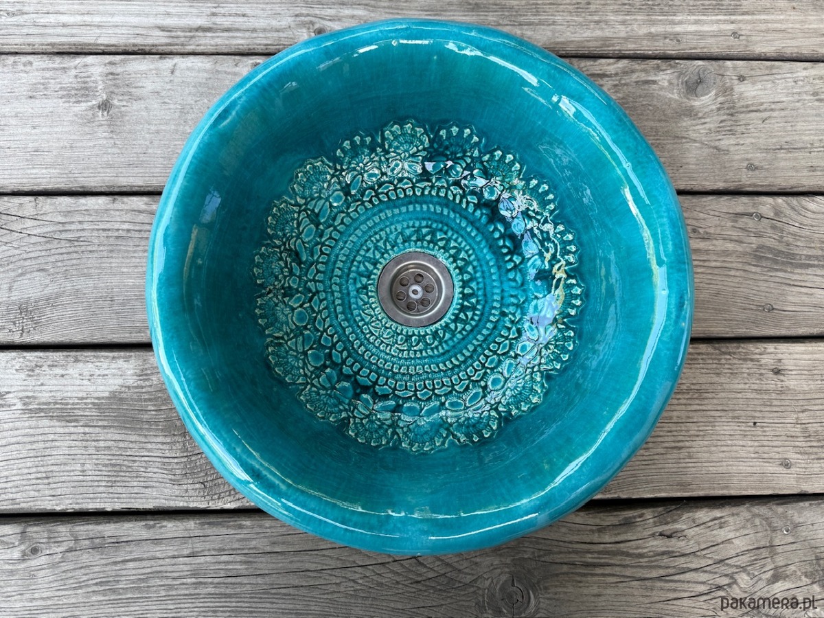 Umywalka ceramiczna, turkusowa, z folkową koronką. Nablatowa, ceramiczna, ręcznie robiona, funkcjonalna i trwała. Wielokrotnie szkliwiona i wypalana, dzięki czemu jest szczelna i trwała.