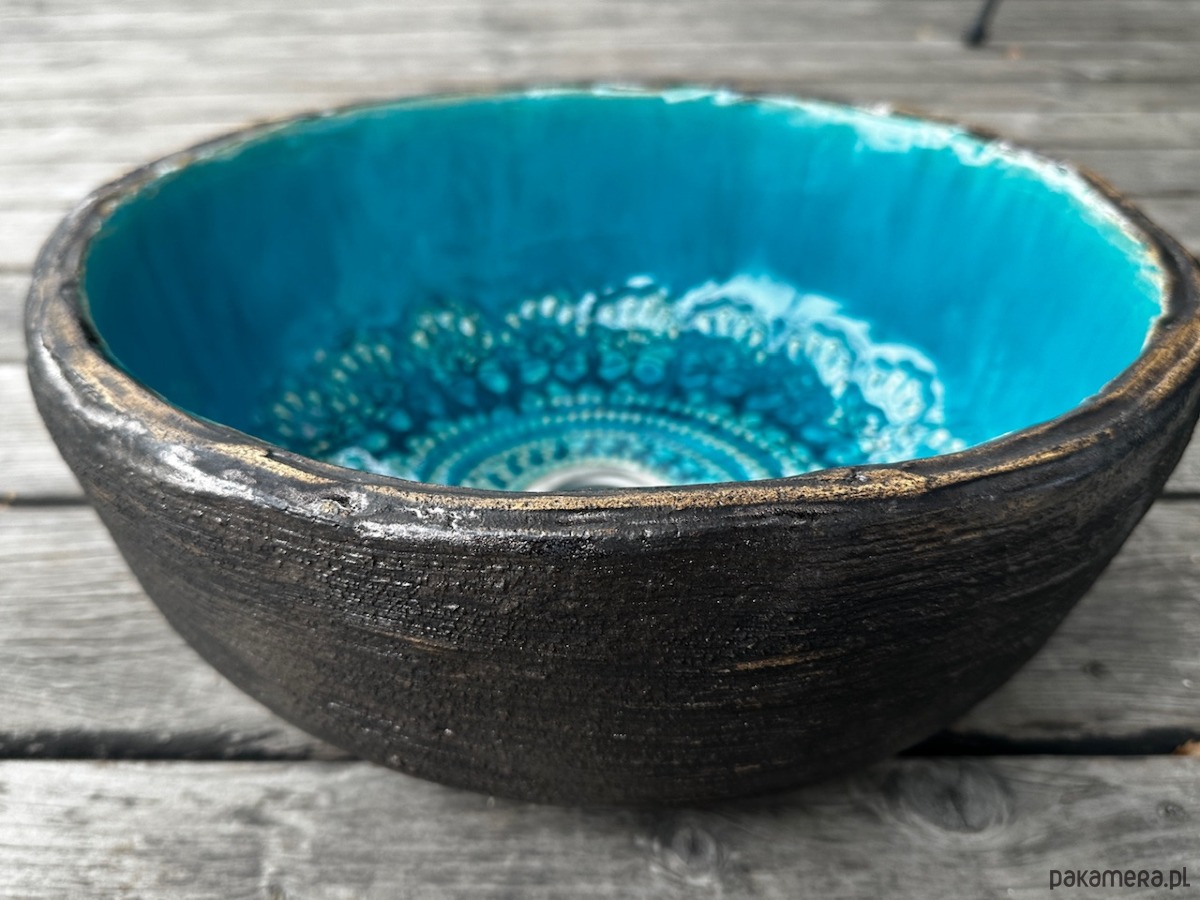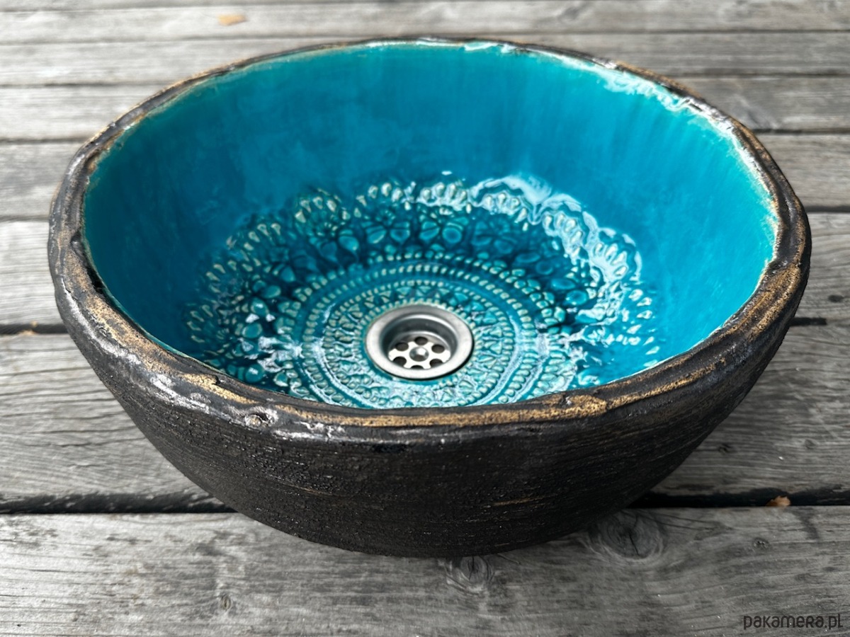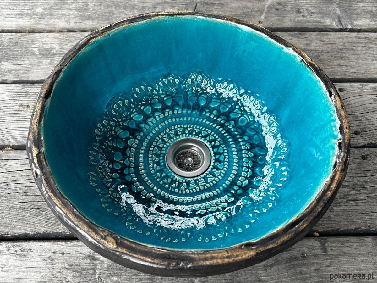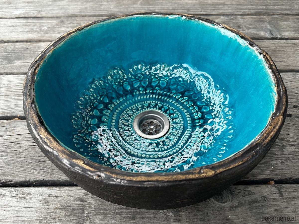 Umywalka ceramiczna, z koronką, nierównym brzegiem, przecierana od zewnątrz.