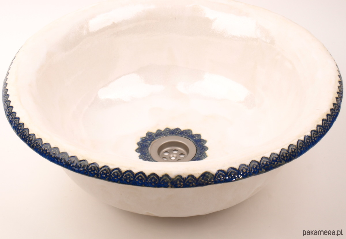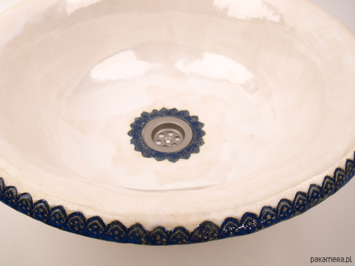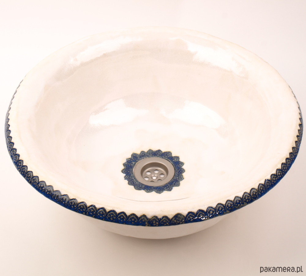 Umywalka okrągła biała z ozdobnym koronkowym rantem oraz delikatną koronką na dnie. Folkowa, duża, nablatowa, ceramiczna, ręcznie robiona, funkcjonalna i trwała. Wielokrotnie szkliwiona i wypalana, dzięki czemu jest szczelna i trwała.