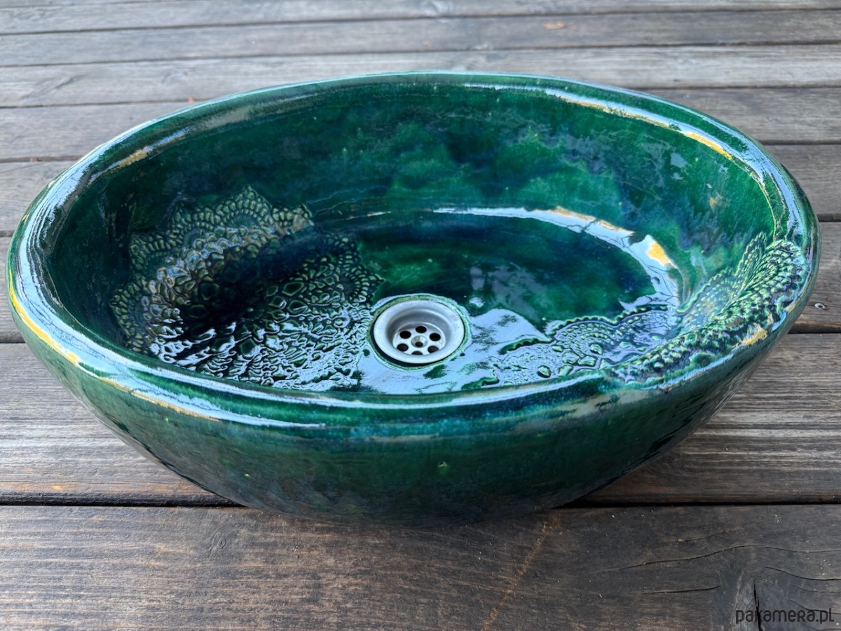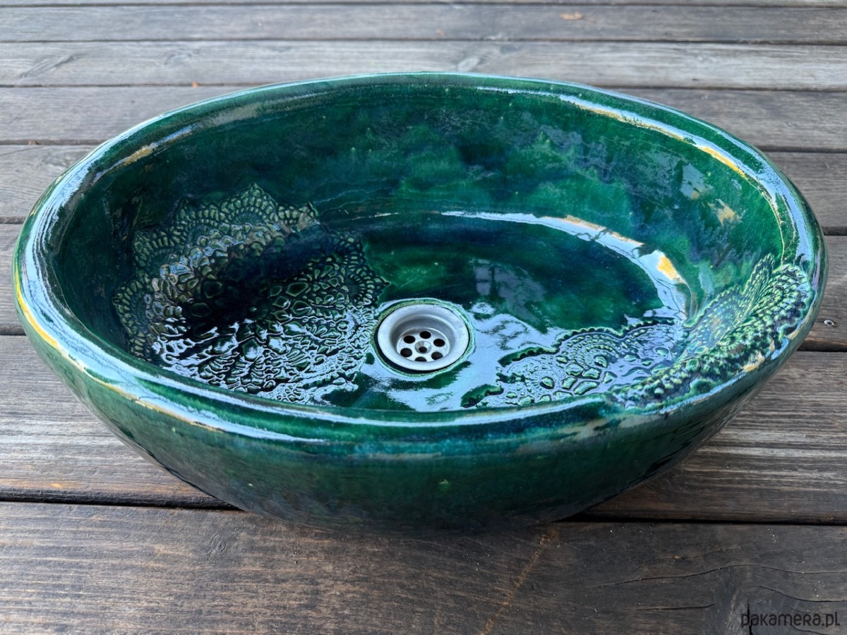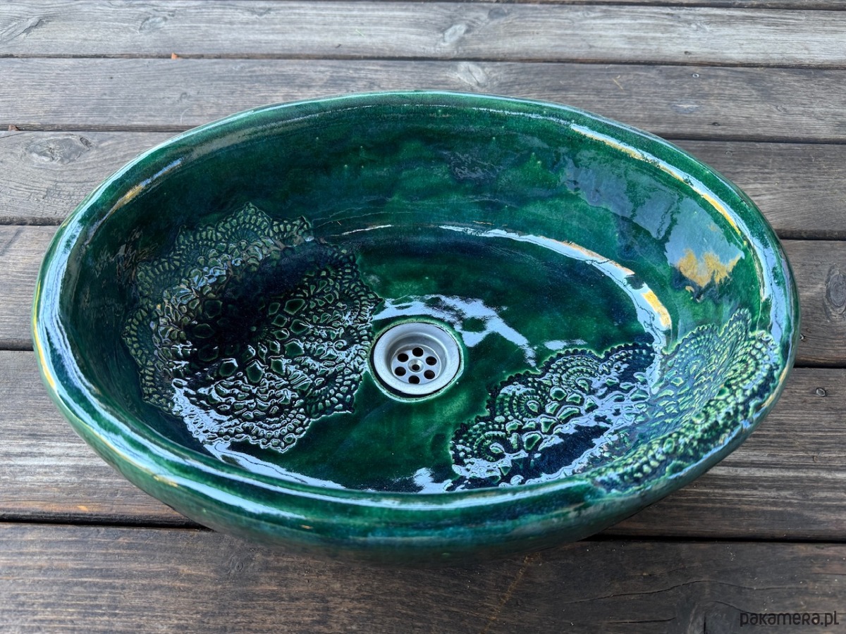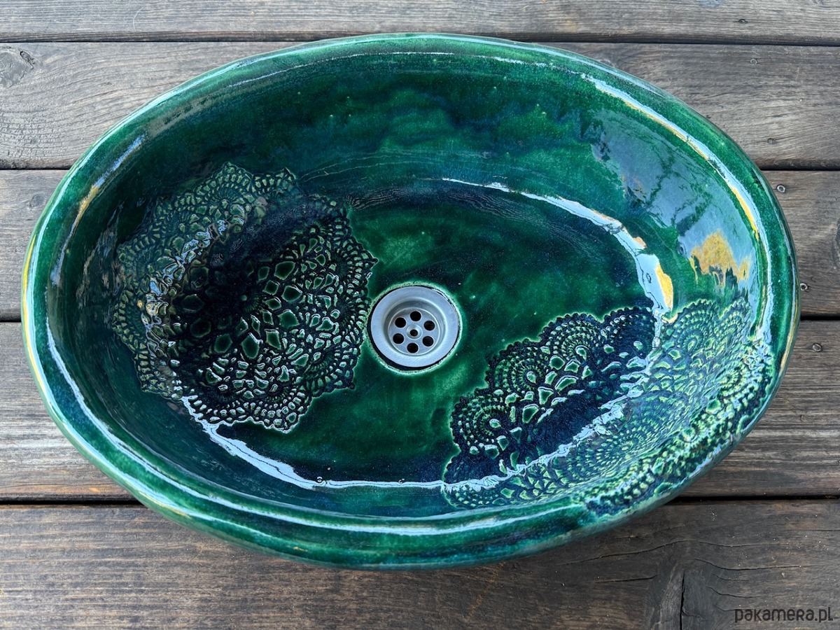 Umywalka ceramiczna, owalna. Kolor butelkowa zieleń, z folkową koronką. Nablatowa, ceramiczna, ręcznie robiona, funkcjonalna i trwała. Wielokrotnie szkliwiona i wypalana, dzięki czemu jest szczelna i trwała.