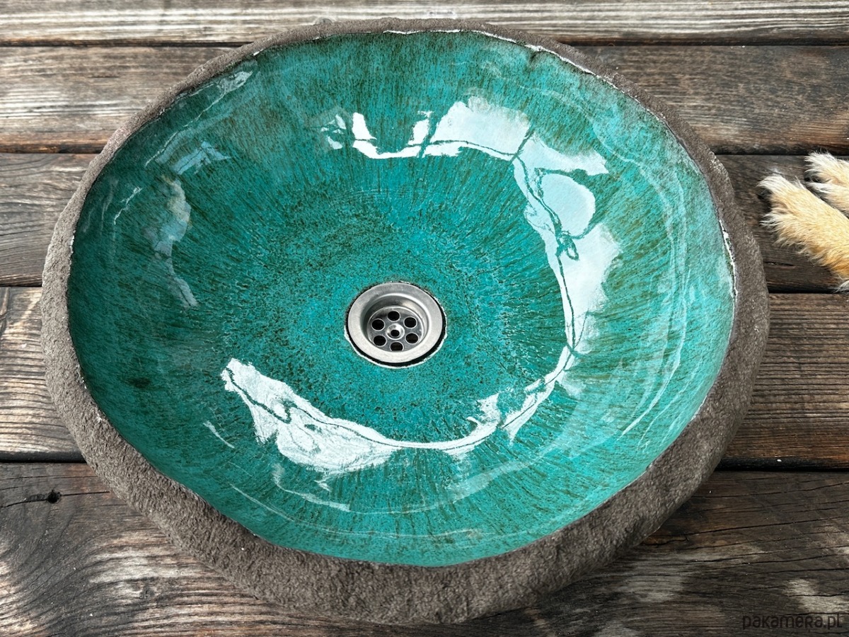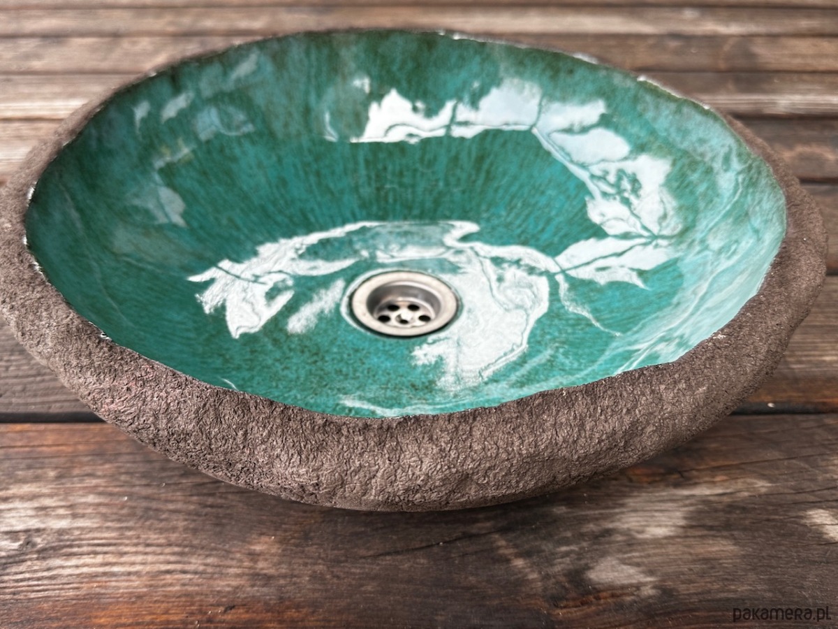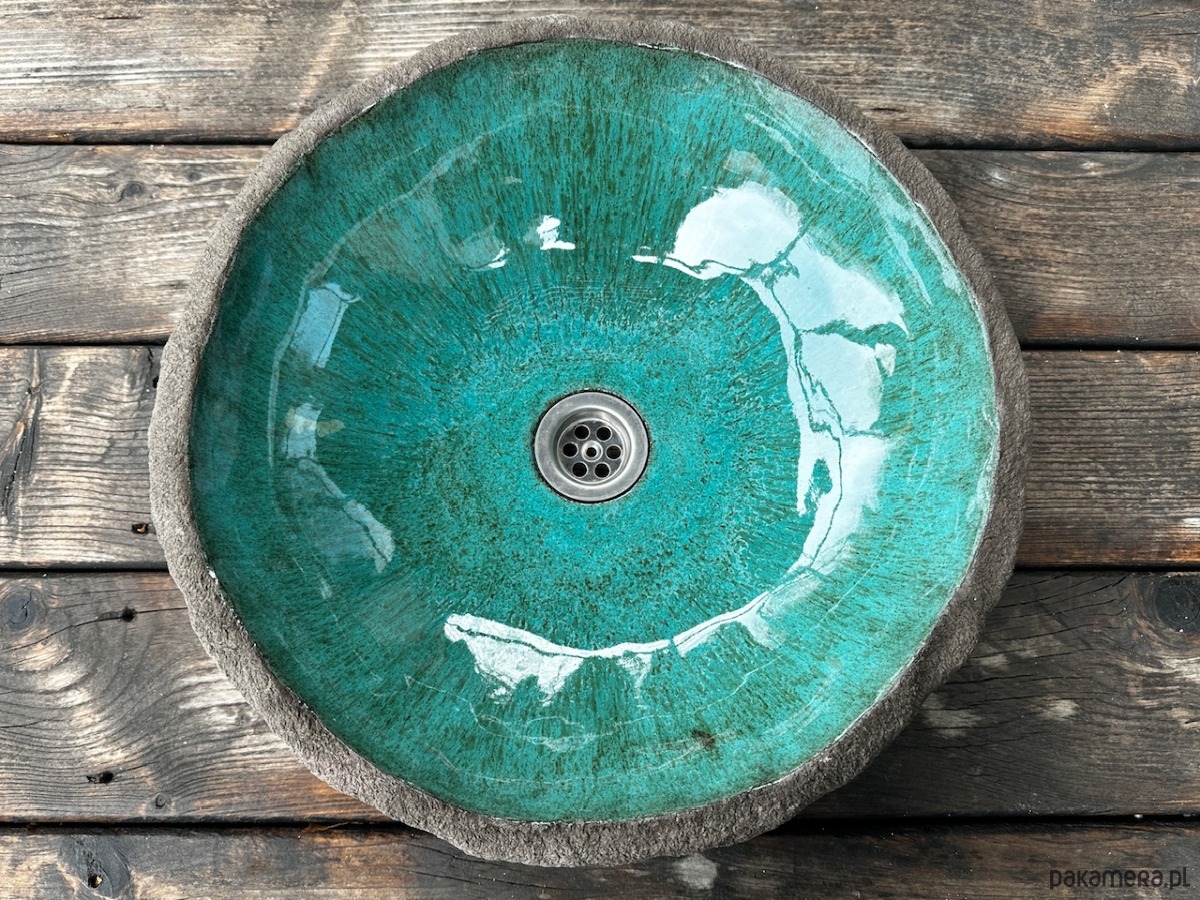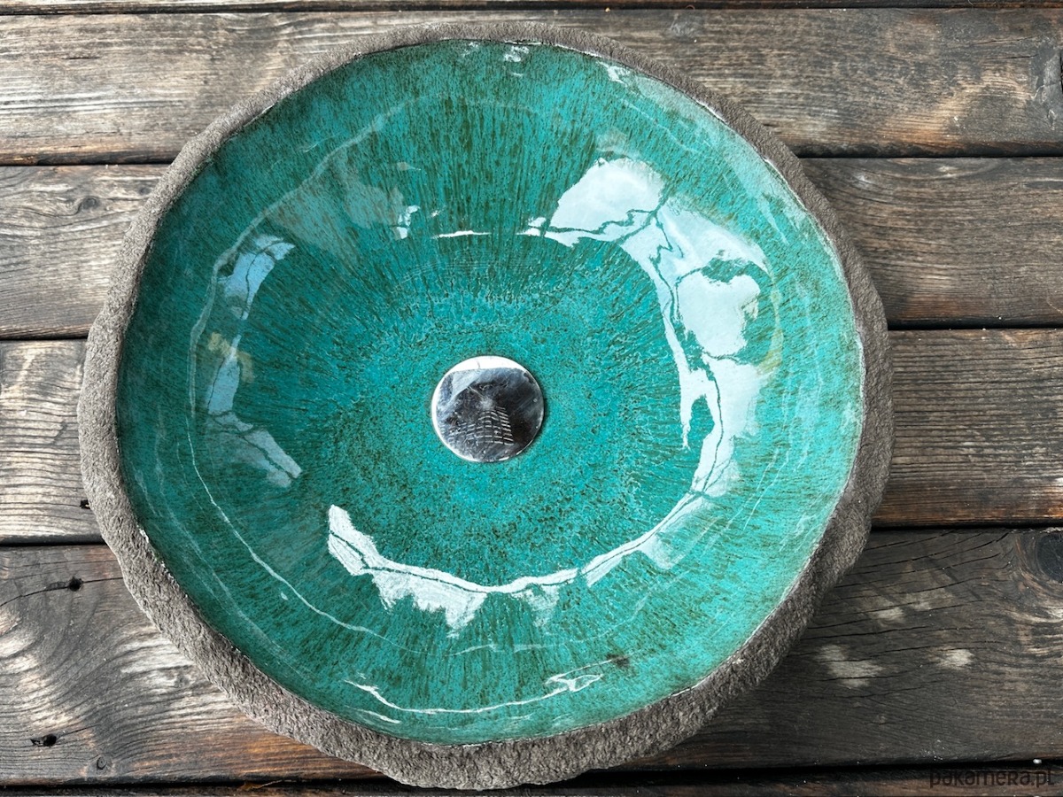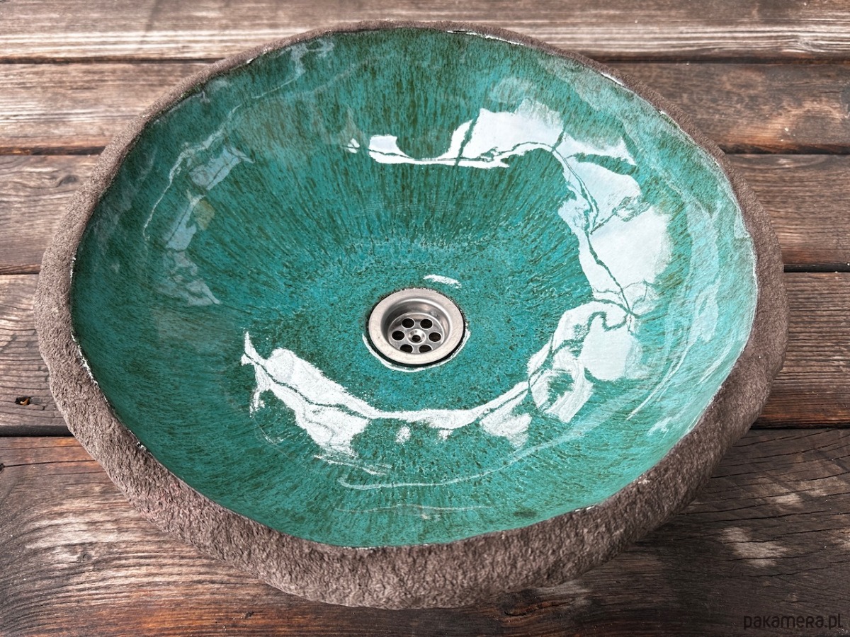 Bardzo nietypowa umywalka ceramiczna, nablatowa, wykonana ręcznie. Soczyste zielone szkliwo wypełnia ciemnobrązową, chropowatą z zewnątrz, "skałę".