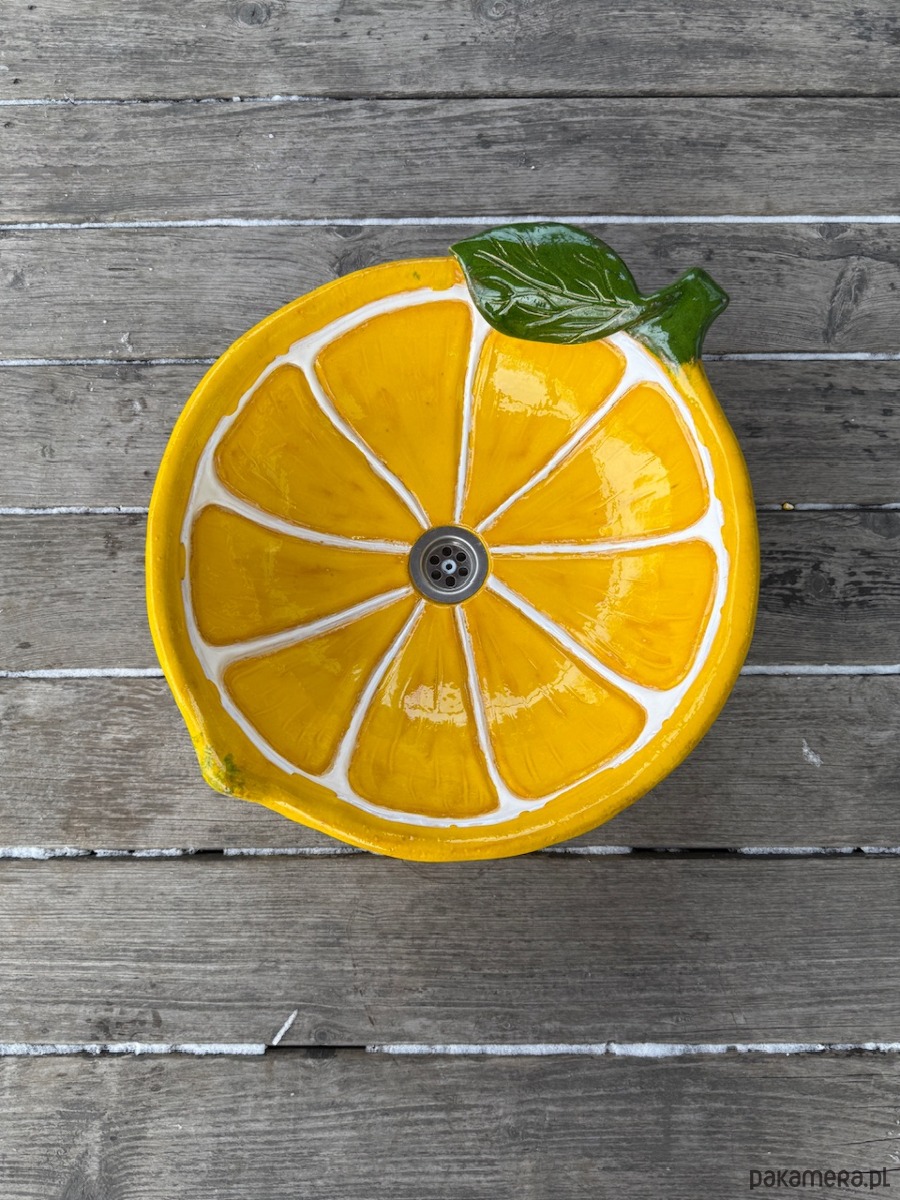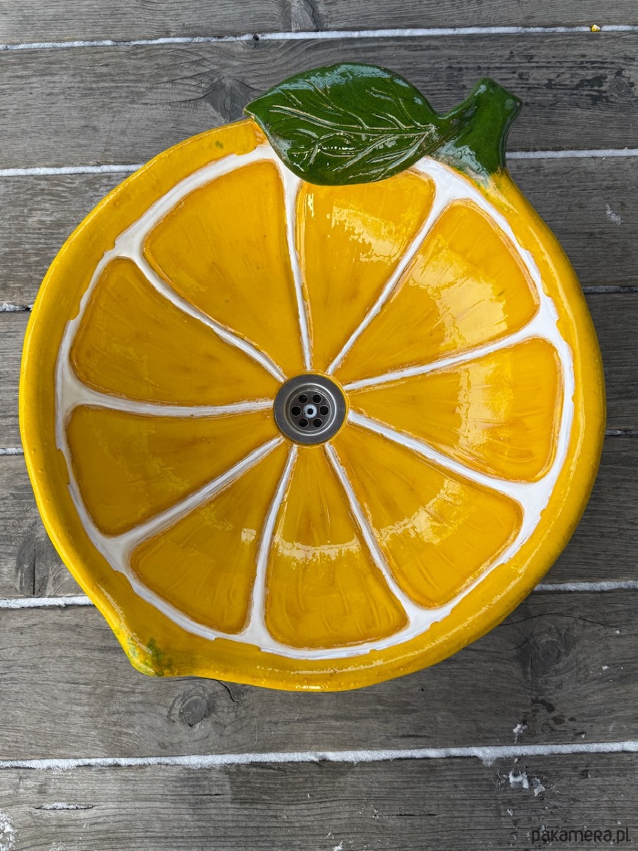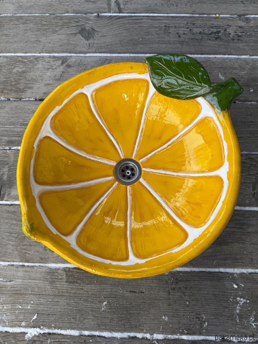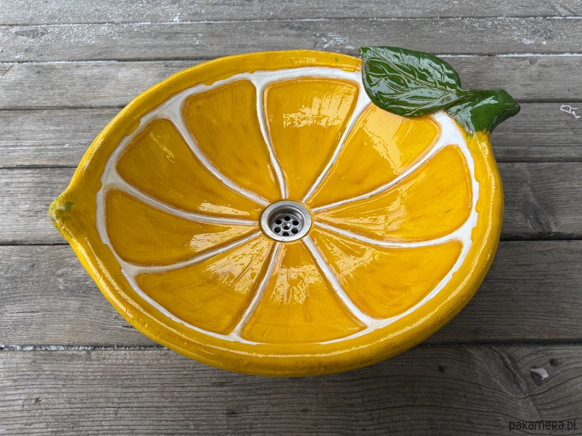 Duża umywalka cytryna, nablatowa, ceramiczna, wykonana ręcznie, funkcjonalna i trwała. Szkliwiona i wypalana wielokrotnie, dzięki czemu jest szczelna i trwała.