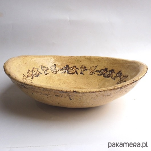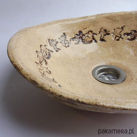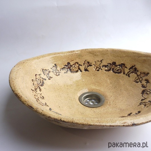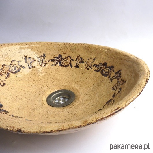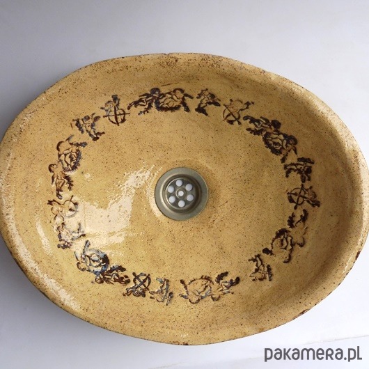 Umywalka ceramiczna, ręcznie formowana i szkliwiona, nablatowa, owalna, przekątne umywalki to 37/30cm, wysokość umywalki ok. 10 cm. Polecam.