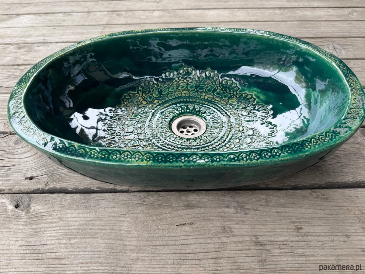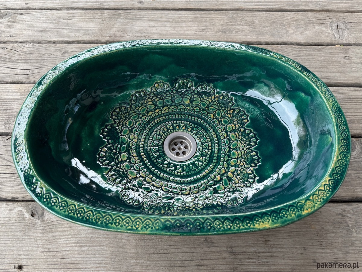 Umywalka ceramiczna, owalna. Kolor - cirpła, butelkowa zieleń, z folkową koronką. Nablatowa, ceramiczna, ręcznie robiona, funkcjonalna i trwała. Wielokrotnie szkliwiona i wypalana, dzięki czemu jest szczelna i trwała.