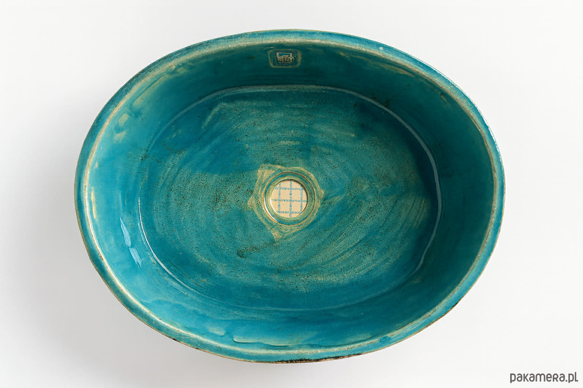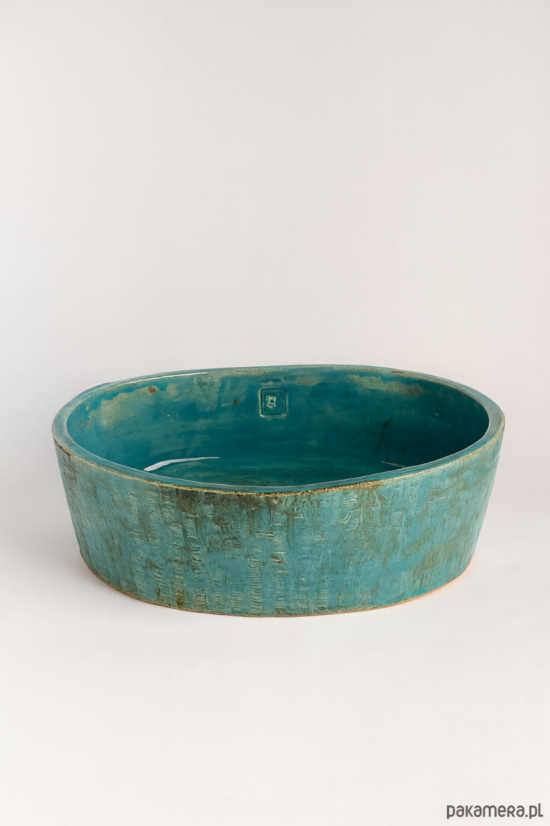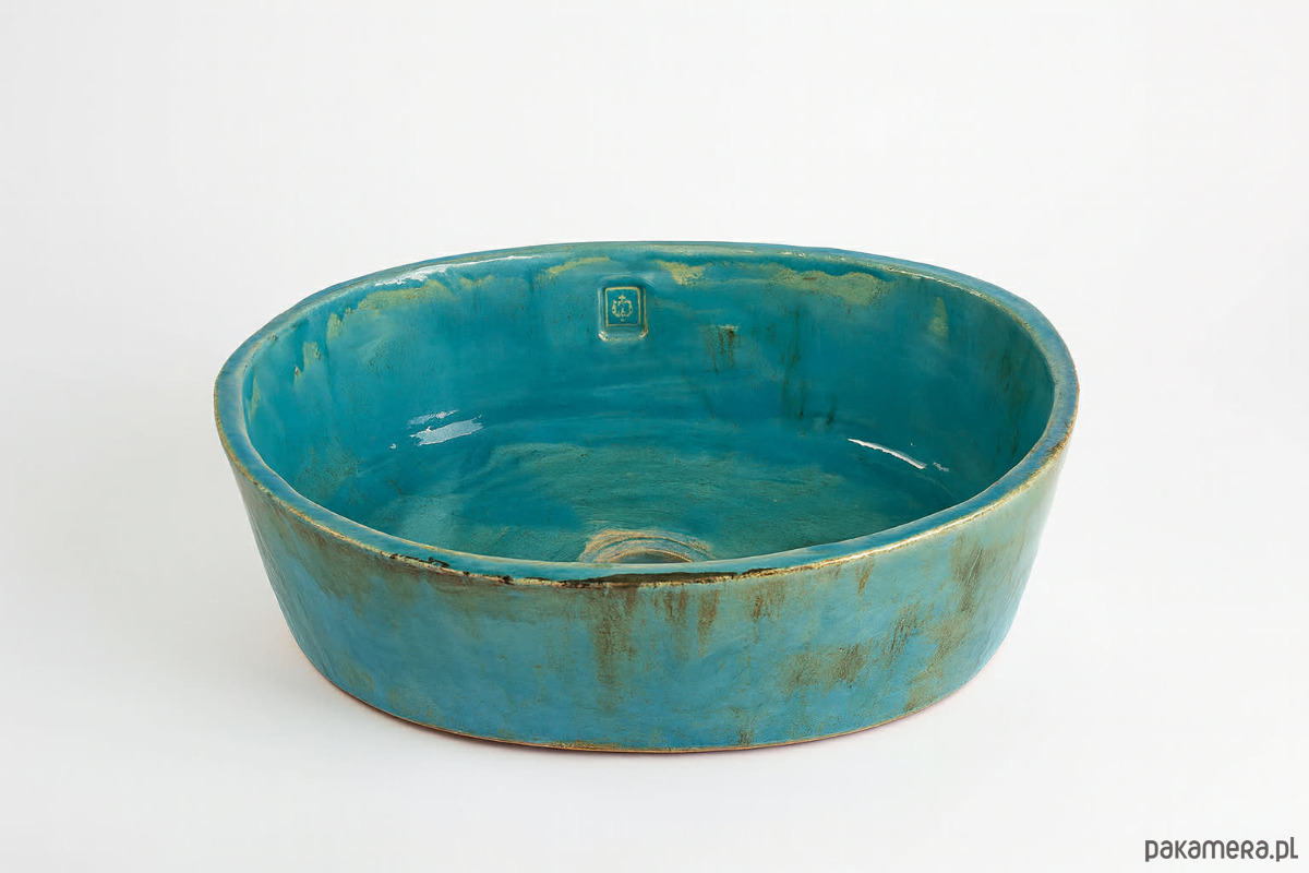 Ręcznie wykonana umywalka nablatowa „Lazur” to unikatowe dzieło sztuki użytkowej, które łączy w sobie naturalne piękno i funkcjonalność. Jej organiczny, owalny kształt oraz niepowtarzalna, ręcznie nakładana glazura sprawiają, że każda sztuka jest wyjątkowa.