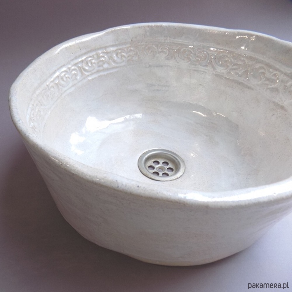 Umywalka ceramiczna, okrągła, nablatowa, ręcznie formowana i szkliwiona w kolorze pełowym, średnica umywalki to ok. 33 cm, wysokość ok. 14,5 cm, polecam.
