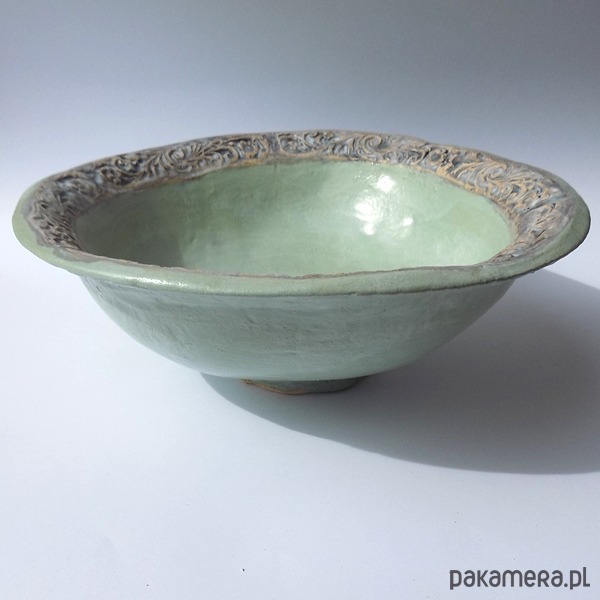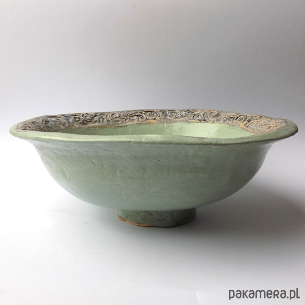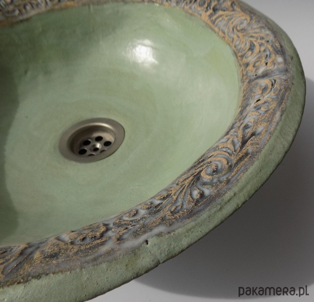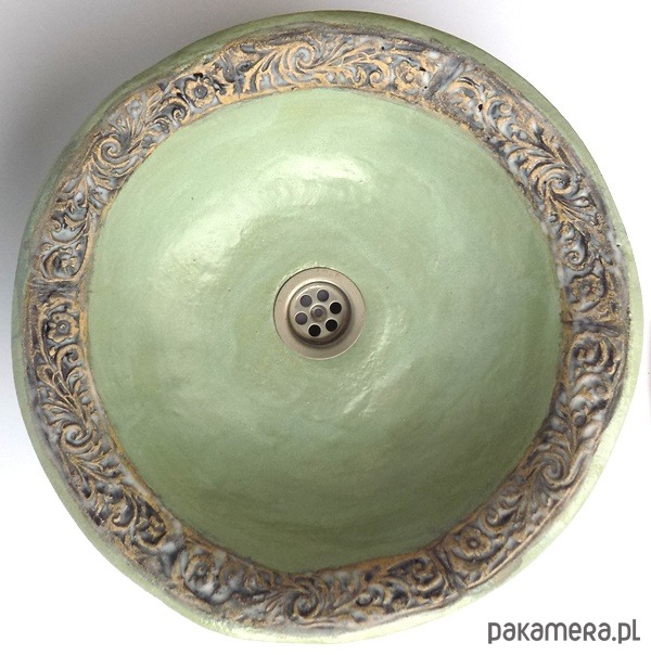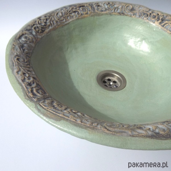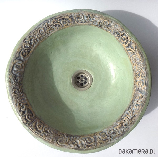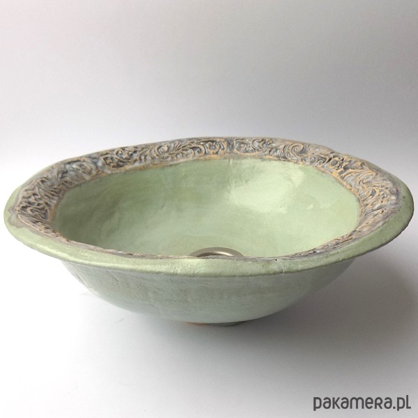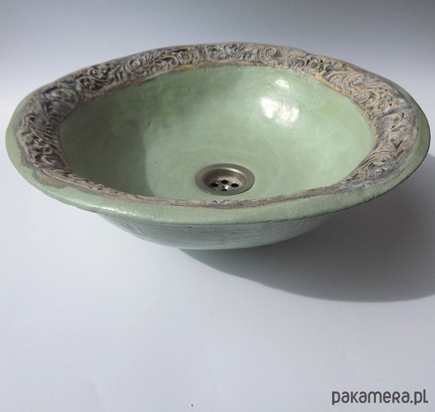 Umywalka ceramiczna, okrągła, nablatowa, ręcznie formowana i szkliwiona w kolorze miętowym, średnica umywalki to 37,5 cm, wysokość 13,5 cm, polecam.
