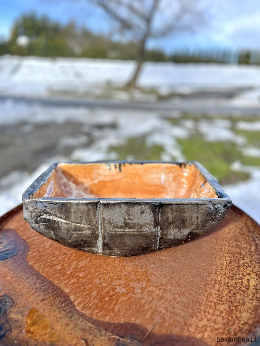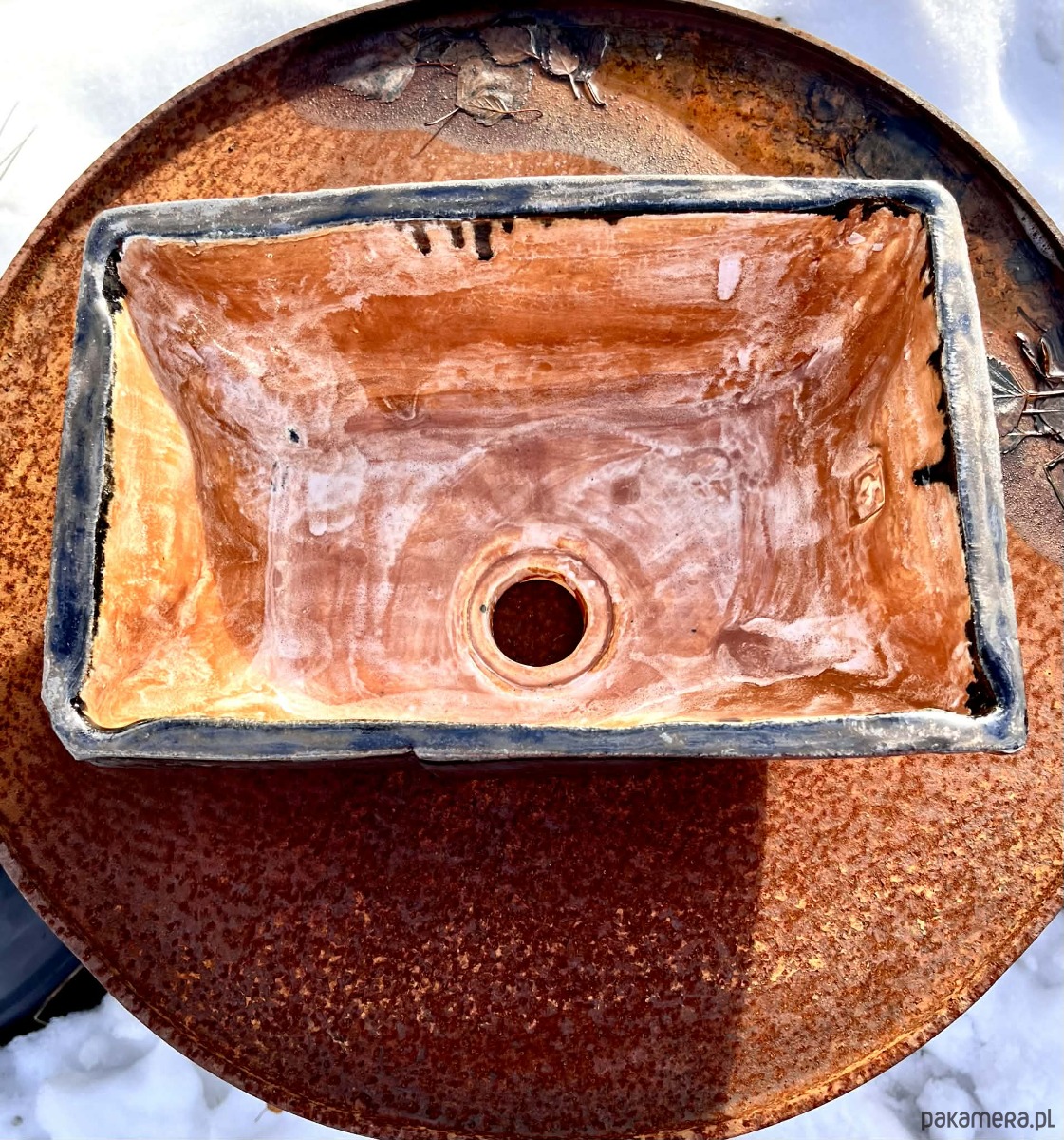 Umywalka ma prostokątną formę, a jej wnętrze pokryte jest szkliwem w barwie bursztynu, przypominającym naturalną strukturę tej wyjątkowej żywicy. Zewnętrzna część zachowuje surowy, rzemieślniczy charakter, co czyni ją idealną do wnętrz nowoczesnych, rustykalnych oraz boho.