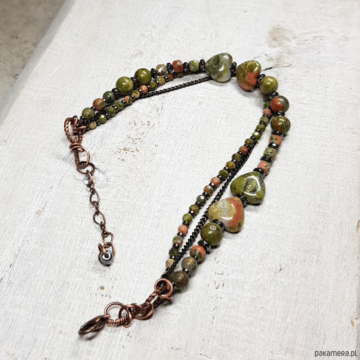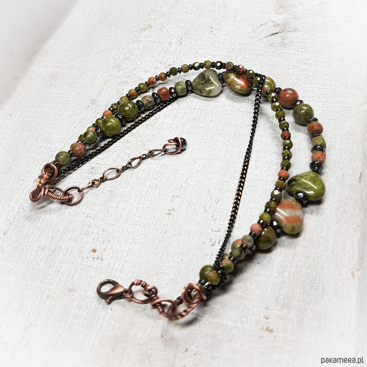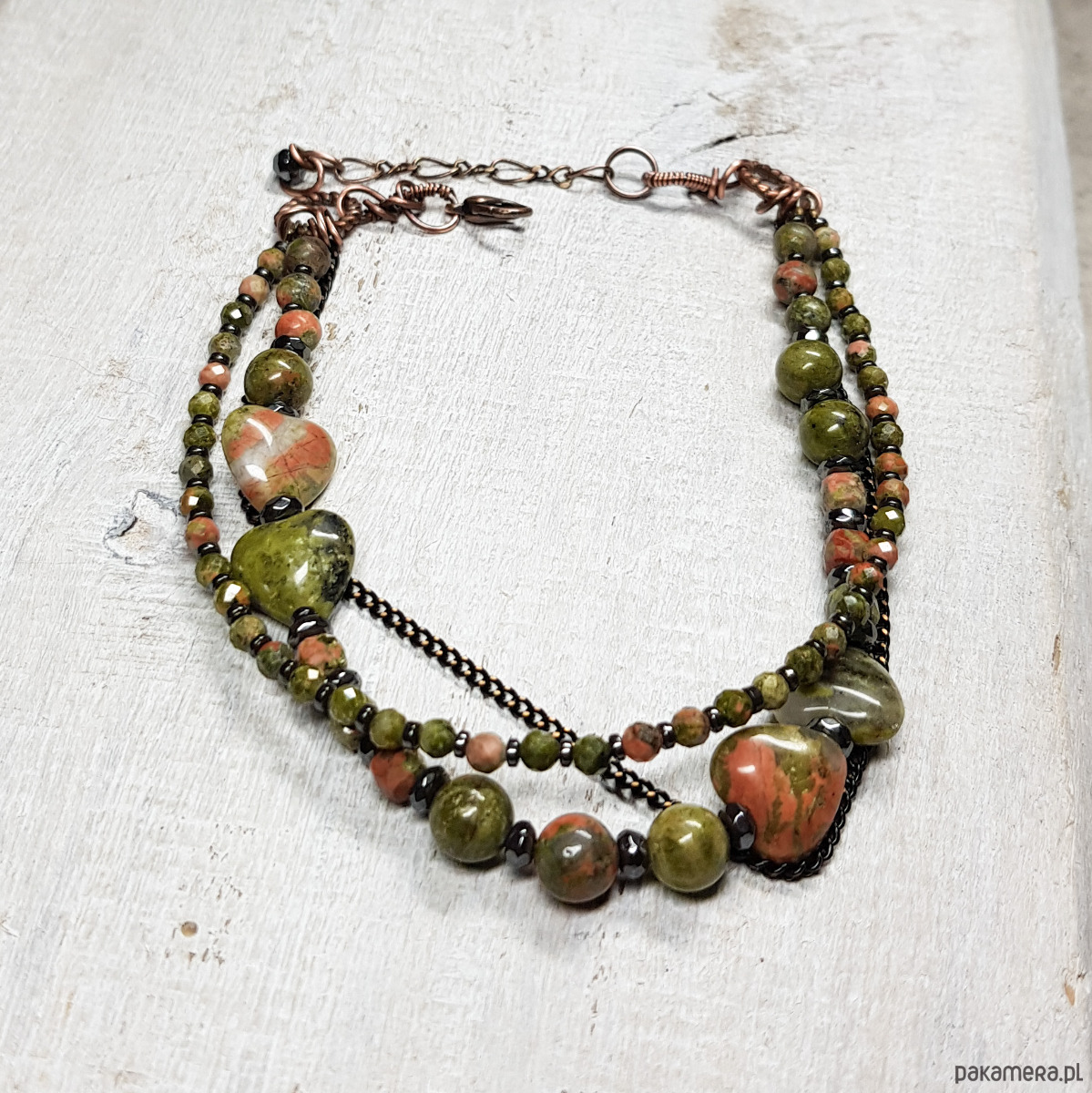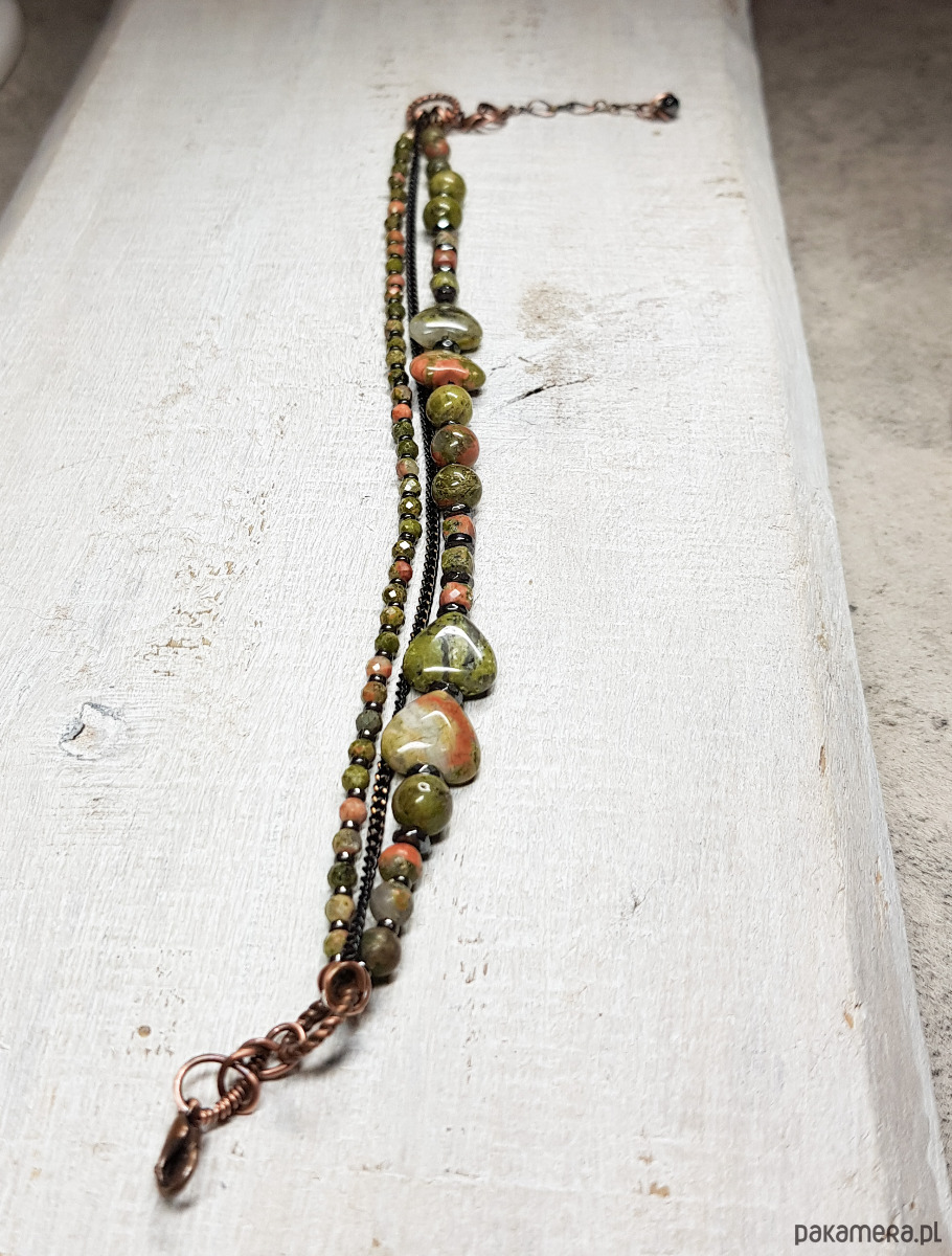bransoletka wykonana ręcznie w miedzi metodą wire-wrappingu z naturalnych koralików unakitu, następnie oksydowana i wypolerowana. Długość bransoletki 21,5 plus 3cm. Całość bardzo spokojna, elegancka, wizytowa, jednocześnie dzięki soczystej zieleni z delikatnymi przebłyskami różu jest radosna, jakby budząca się do życia.