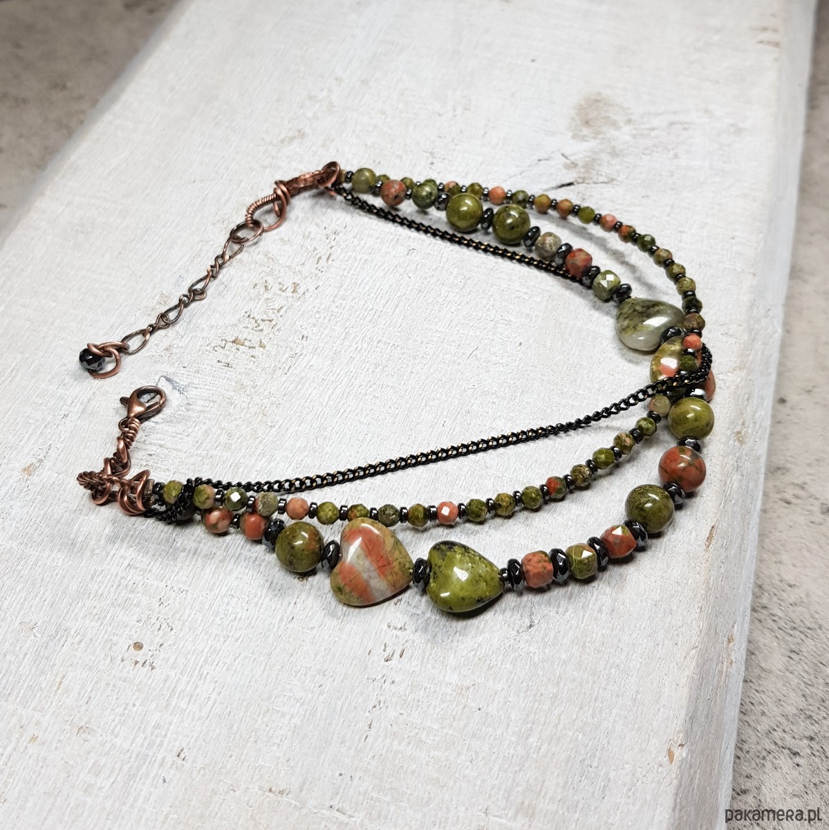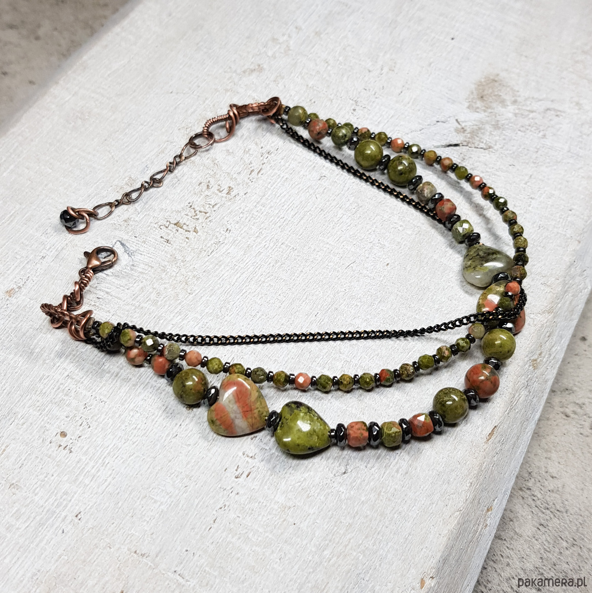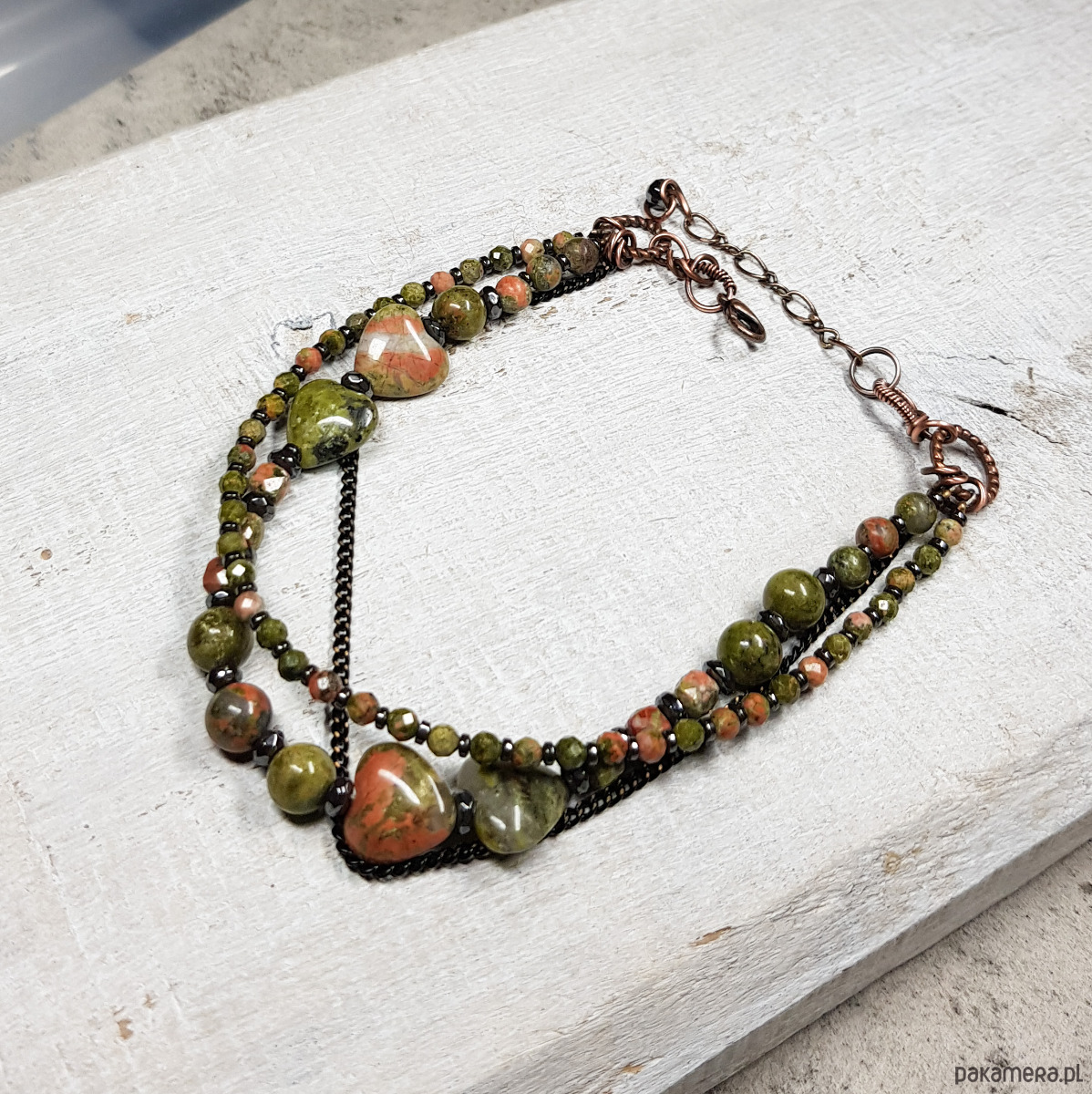bransoletka wykonana ręcznie w miedzi metodą wire-wrappingu z naturalnych koralików unakitu, następnie oksydowana i wypolerowana. Długość bransoletki 21,5 plus 3cm. Całość bardzo spokojna, elegancka, wizytowa, jednocześnie dzięki soczystej zieleni z delikatnymi przebłyskami różu jest radosna, jakby budząca się do życia.